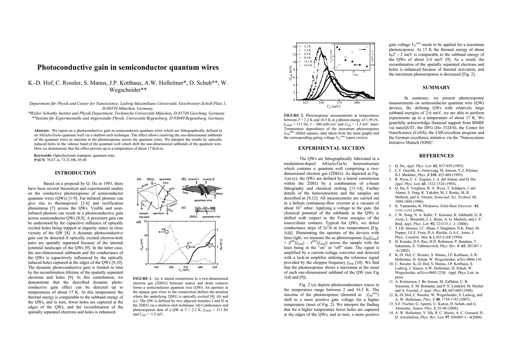We report on a photoconductive gain in semiconductor quantum wires which are lithographically defined in an AlGaAs/GaAs quantum well via a shallow-etch technique. The effect allows resolving the one-dimensional subbands of the quantum wires as maxima in the photoresponse across the quantum wires. We interpret the results by optically induced holes in the valence band of the quantum well which shift the one-dimensional subbands of the quantum wire. Here we demonstrate that the effect persists up to a temperature of about 17 Kelvin.