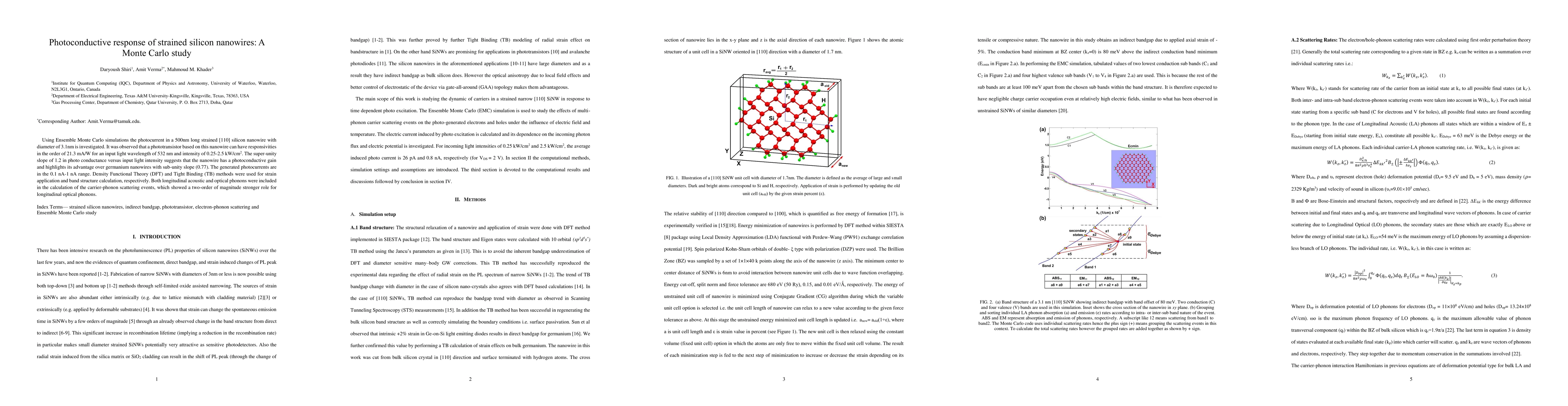 Using Ensemble Monte Carlo simulations the photocurrent in a 500nm long strained [110] silicon nanowire with diameter of 3.1 nm is investigated. It was observed that a phototransistor based on this nanowire can have responsivities in the order of 21.3 mA/W for an input light wavelength of 532 nm and intensity of 0.25-2.5 kW/cm2. The super-unity slope of 1.2 in photo conductance versus input light intensity suggests that the nanowire has a photoconductive gain and highlights its advantage over germanium nanowires with sub-unity slope (0.77). The generated photocurrents are in the 0.1 nA-1 nA range. Density Functional Theory (DFT) and Tight Binding (TB) methods were used for strain application and band structure calculation, respectively. Both longitudinal acoustic and optical phonons were included in the calculation of the carrier-phonon scattering events, which showed a two-order of magnitude stronger role for longitudinal optical phonons.