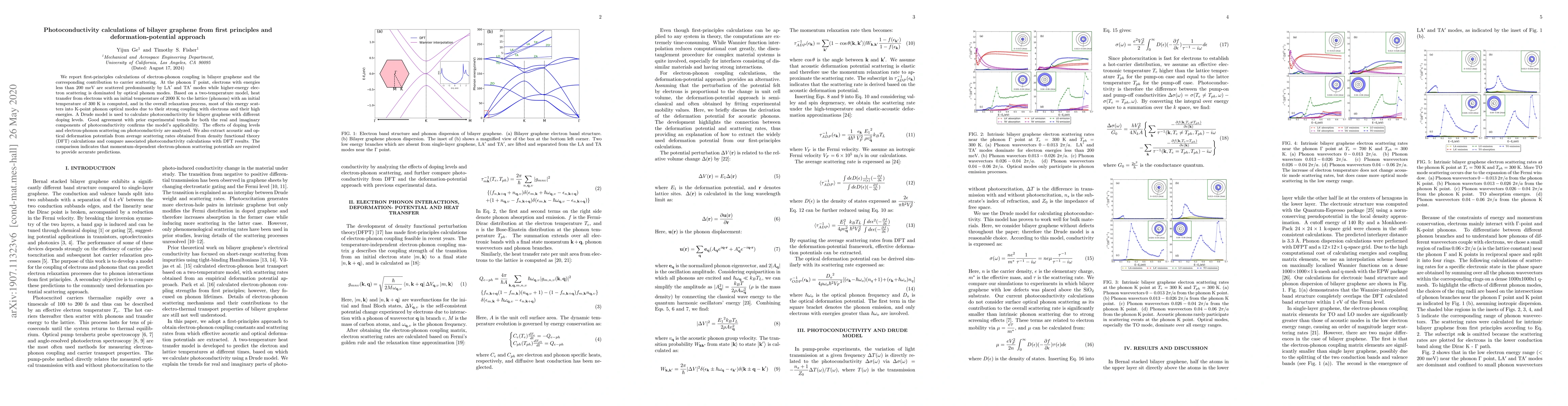 This study uses first-principles calculations to analyze electron-phonon coupling in bilayer graphene and its effect on carrier scattering, finding that lower-energy electrons scatter primarily via LA' and TA' phonon modes while higher-energy electrons scatter via optical phonons. The research also computes photoconductivity using a Drude model, showing good agreement with experimental trends and highlighting the importance of doping levels and scattering potentials for accurate predictions.