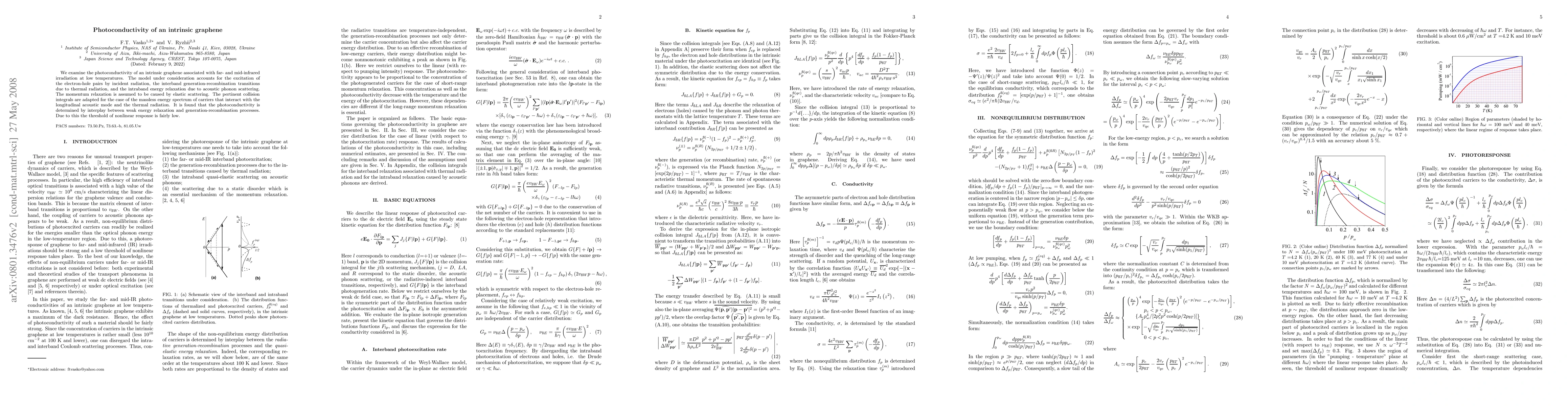 This study investigates the photoconductivity of intrinsic graphene under far- and mid-infrared irradiation at low temperatures, focusing on electron-hole pair excitation, interband transitions, and intraband relaxation via acoustic phonon scattering. The research reveals that the photoconductivity results from a balance between weak energy relaxation and generation-recombination processes, leading to a low threshold for nonlinear response.
