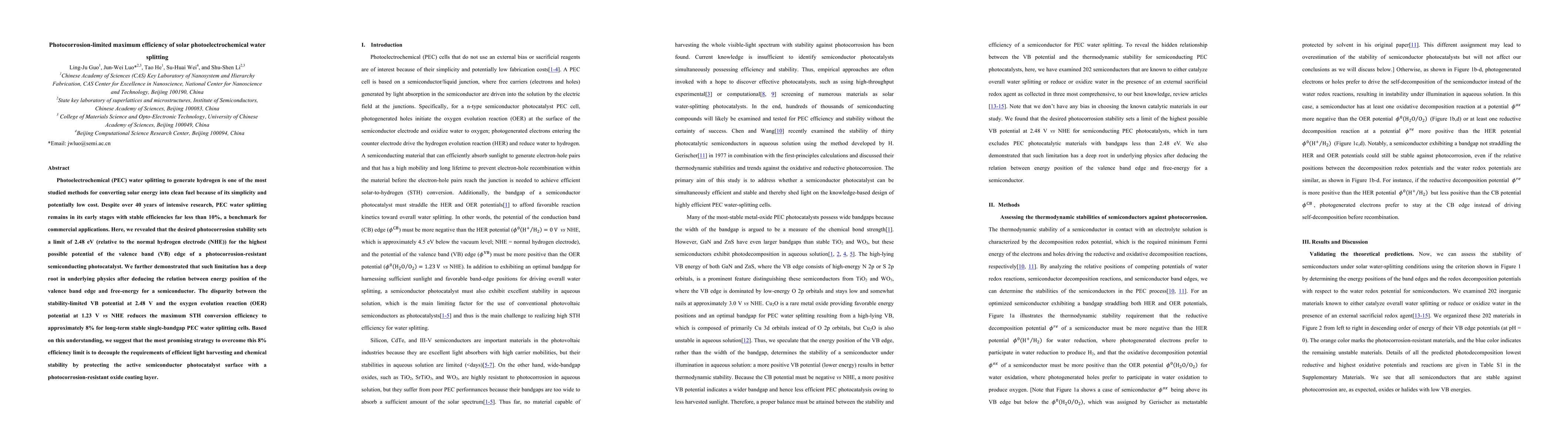 This paper reveals that photocorrosion stability limits the maximum efficiency of solar photoelectrochemical water splitting to approximately 8% due to the disparity between the valence band edge potential and the oxygen evolution reaction potential. To overcome this limit, the authors propose using a photocorrosion-resistant oxide coating to protect the semiconductor photocatalyst.