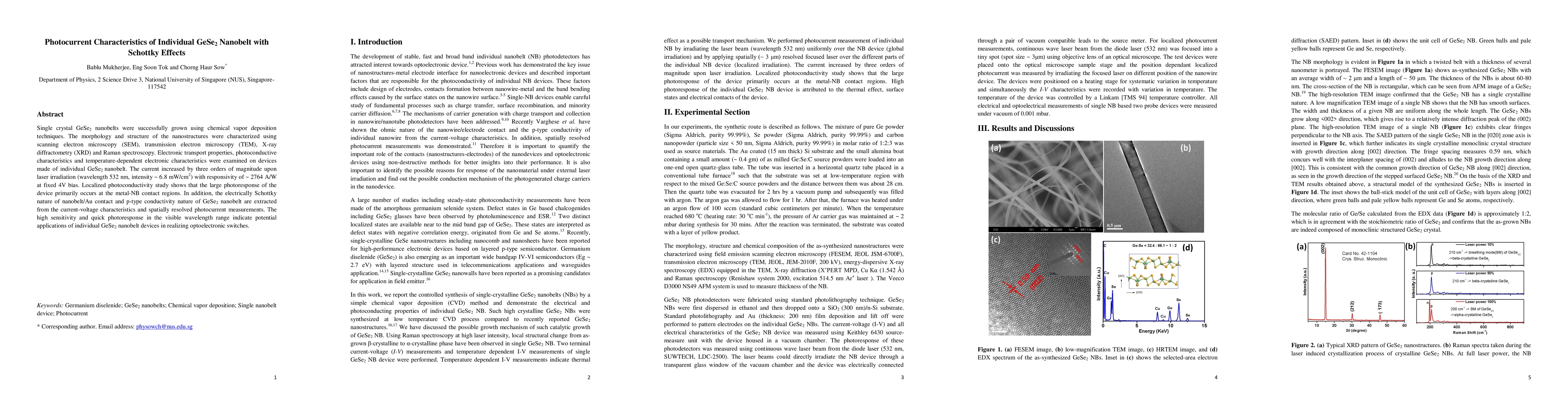 Single crystal GeSe2 nanobelts (NBs) were successfully grown using chemical vapor deposition techniques. The morphology and structure of the nanostructures were characterized using scanning electron microscopy, transmission electron microscopy, X-ray diffractometry, and Raman spectroscopy. Electronic transport properties, photoconductive characteristics, and temperature-dependent electronic characteristics were examined on devices made of individual GeSe2 nanobelt. Localized photoconductivity study shows that the large photoresponse of the device primarily occurs at the metal-NB contact regions. In addition, the electrically Schottky nature of nanobelt-Au contact and p-type conductivity nature of GeSe2 nanobelt are extracted from the current-voltage characteristics and spatially resolved photocurrent measurements. The high sensitivity and quick photoresponse in the visible wavelength range indicate potential applications of individual GeSe2 nanobelt devices in realizing optoelectronic switches.