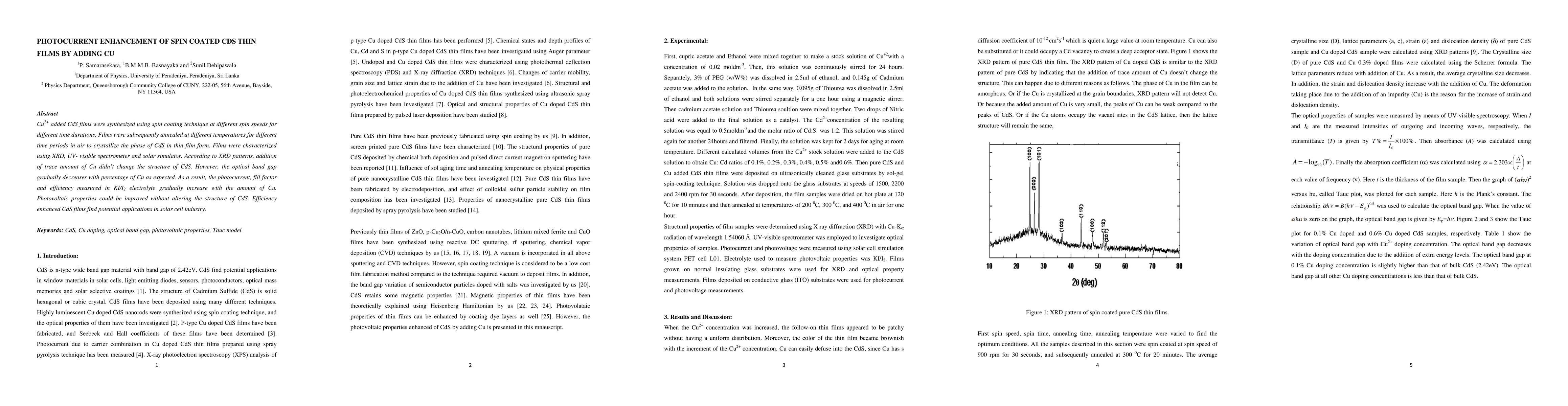 The addition of Cu to CdS thin films improves photocurrent and efficiency without altering the structure of CdS, making it a potential application in solar cell industry.