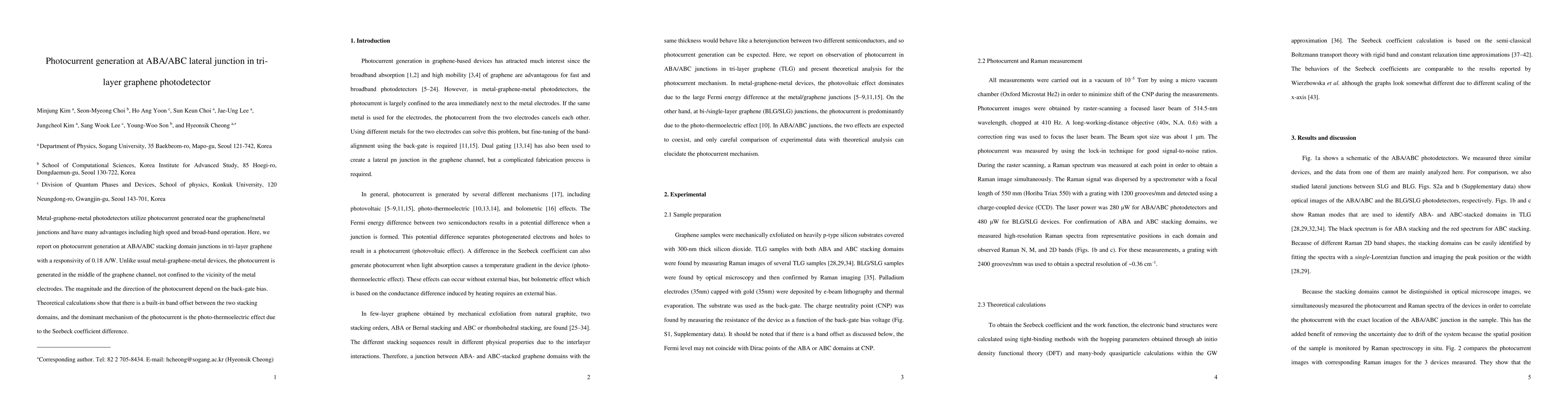 This study investigates a novel tri-layer graphene photodetector featuring photocurrent generation at ABA/ABC stacking domain junctions, achieving a responsivity of 0.18 A/W. Unlike conventional metal-graphene-metal devices, the photocurrent arises in the graphene channel's center, influenced by back-gate bias, and is primarily driven by the photo-thermoelectric effect due to differing Seebeck coefficients.