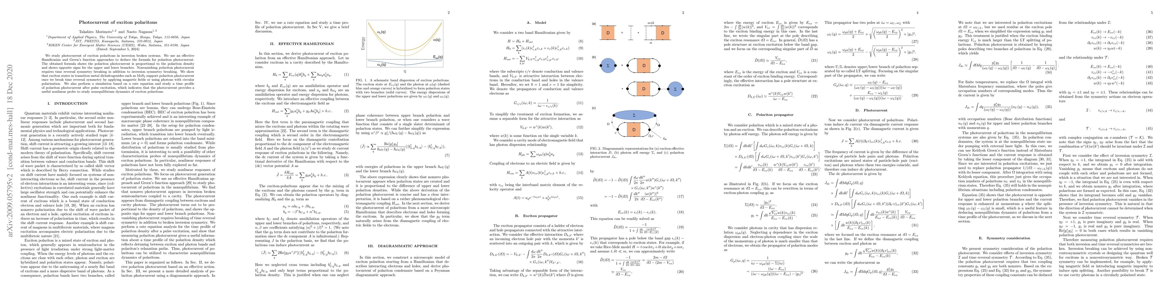 We study photocurrent of exciton polaritons in inversion broken systems. We use an effective Hamiltonian and Green's function approaches to deduce the formula for polariton photocurrent. The obtained formula shows the polariton photocurrent is proportional to the polariton density and shows opposite signs for the upper and lower branches. Nonvanishing polariton photocurrent requires time reversal symmetry breaking in addition to inversion symmetry breaking. We show that exciton states in transition metal dichalcogenides such as MoS$_2$ support polariton photocurrent once we break time reversal symmetry by applying magnetic fields or using photons with circular polarization. We also perform a simulation based on a rate equation and study a time profile of polariton photocurrent after pulse excitation, which indicates that the photocurrent provides a useful nonlinear probe to study nonequilibrium dynamics of exciton polaritons.