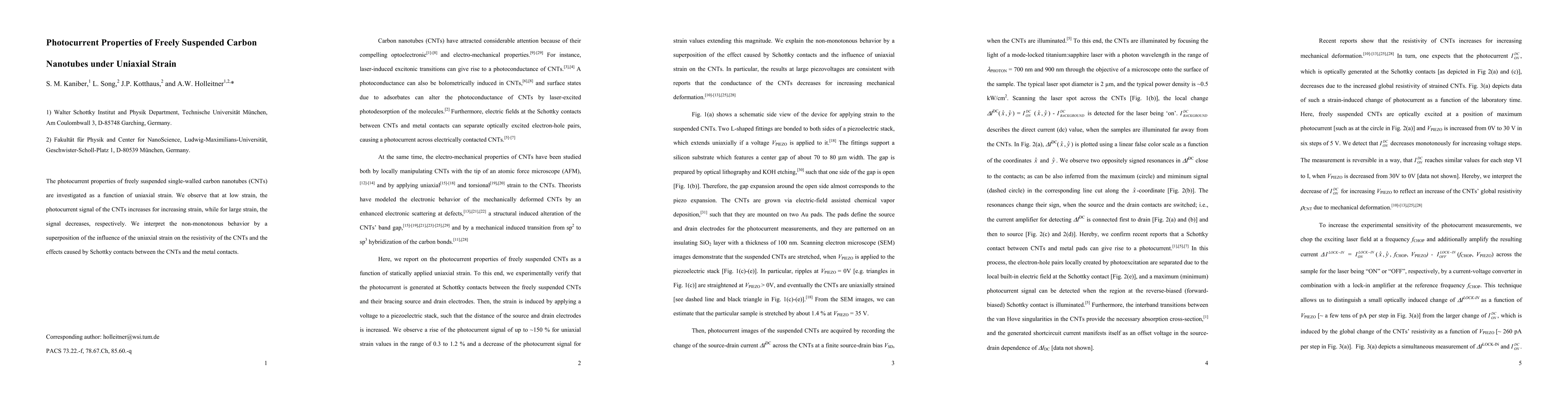 This study investigates how uniaxial strain affects the photocurrent properties of freely suspended single-walled carbon nanotubes, finding that photocurrent increases with low strain but decreases at high strain due to changes in resistivity and Schottky contact effects.