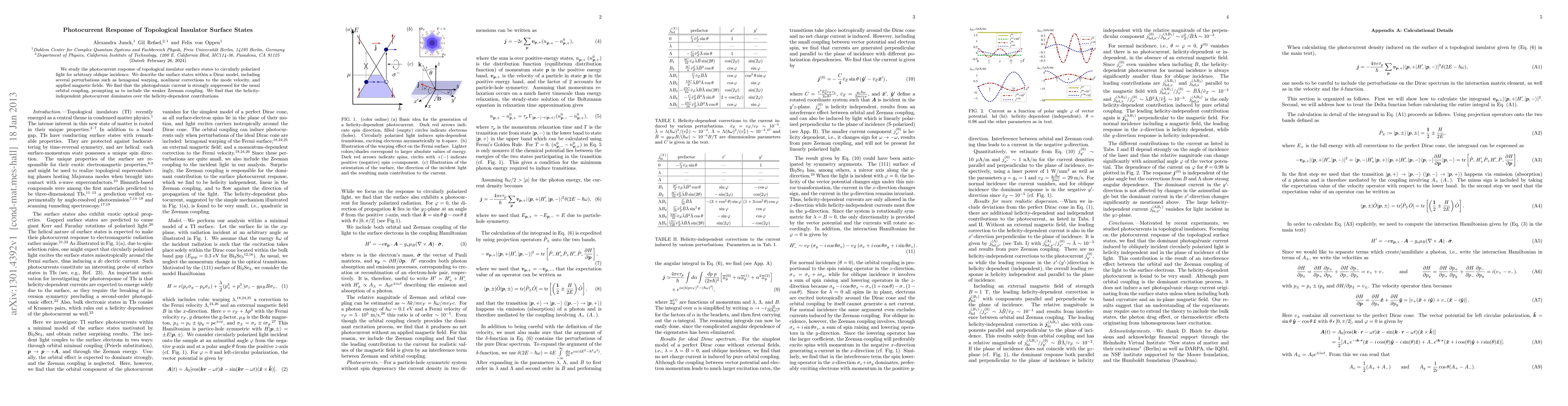 We study the photocurrent response of topological insulator surface states to circularly polarized light for arbitrary oblique incidence. We describe the surface states within a Dirac model, including several perturbations such as hexagonal warping, nonlinear corrections to the mode velocity, and applied magnetic fields. We find that the photogalvanic current is strongly suppressed for the usual orbital coupling, prompting us to include the weaker Zeeman coupling. We find that the helicity-independent photocurrent dominates over the helicity-dependent contributions.
