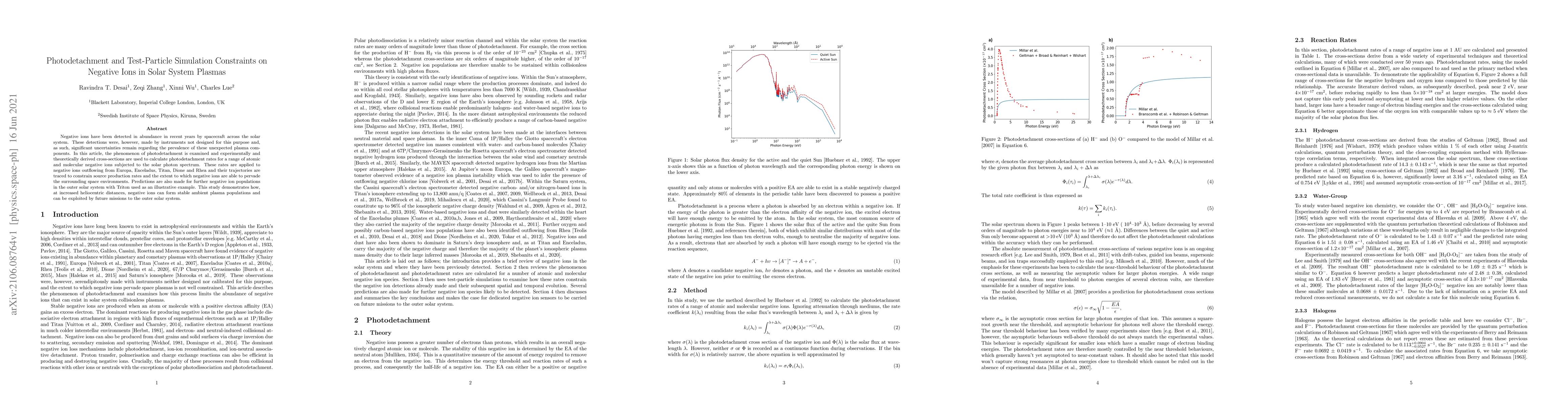 This study uses photodetachment rates to simulate negative ions in solar system plasmas, predicting stable populations at outer distances that could be exploited by future missions.