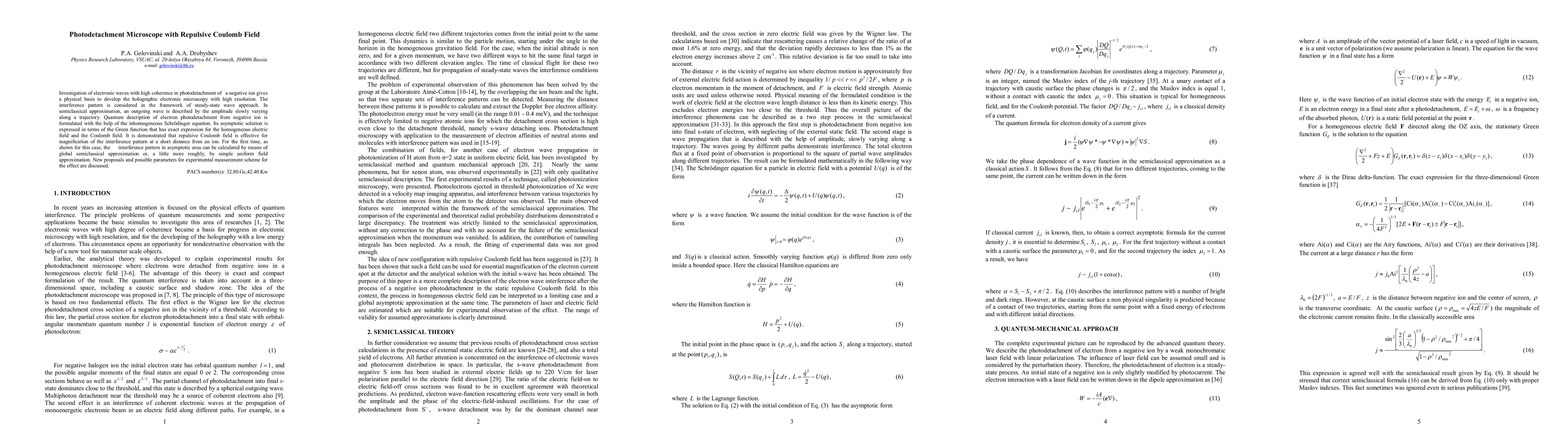 This paper develops a photodetachment microscope using a repulsive Coulomb field to enhance the resolution of holographic electronic microscopy. It demonstrates that the interference pattern can be magnified and calculated using semiclassical approximations, proposing new experimental parameters for measuring this effect.