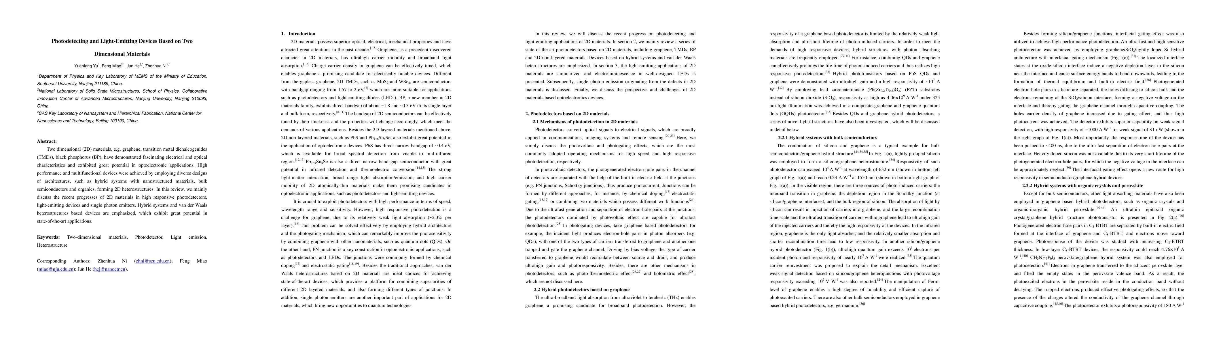 This paper reviews recent advances in optoelectronic devices utilizing two-dimensional materials like graphene, TMDs, and black phosphorus, focusing on high-responsive photodetectors, light-emitting devices, and single photon emitters. It highlights the potential of hybrid systems and van der Waals heterostructures in cutting-edge applications.