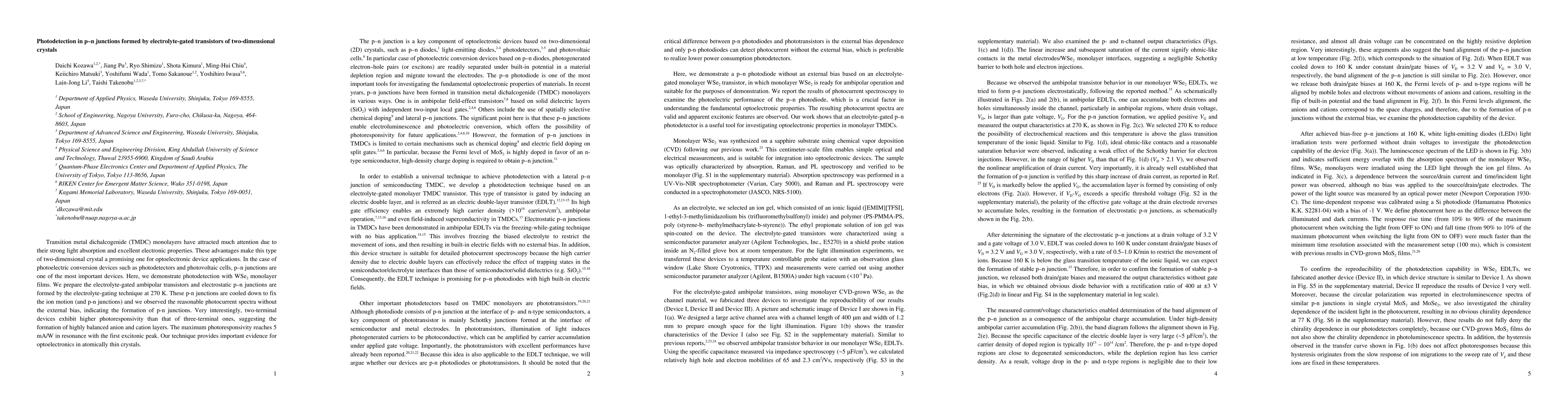This paper demonstrates photodetection in WSe2 monolayer films using electrolyte-gated transistors to form p-n junctions, showing higher photoresponsivity in two-terminal devices and achieving a maximum photoresponsivity of 5 mA/W, highlighting the potential of two-dimensional crystals for optoelectronic applications.