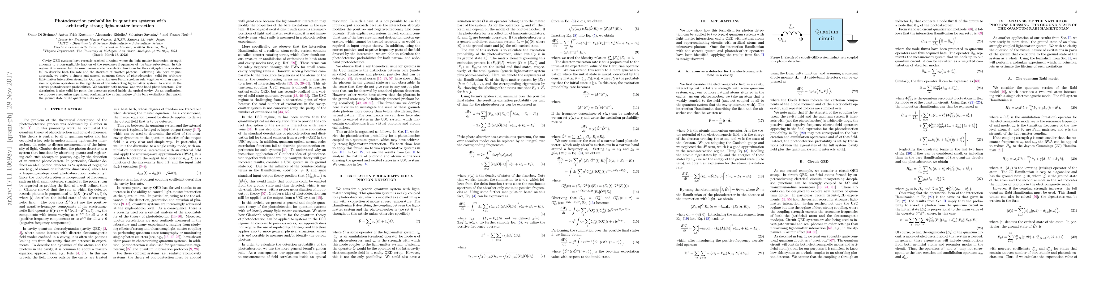 Cavity-QED systems have recently reached a regime where the light-matter interaction strength amounts to a non-negligible fraction of the resonance frequencies of the bare subsystems. In this regime, it is known that the usual normal-order correlation functions for the cavity-photon operators fail to describe both the rate and the statistics of emitted photons. Following Glauber's original approach, we derive a simple and general quantum theory of photodetection, valid for arbitrary light-matter interaction strengths. Our derivation uses Fermi's golden rule, together with an expansion of system operators in the eigenbasis of the interacting light-matter system, to arrive at the correct photodetection probabilities. We consider both narrow- and wide-band photodetectors. Our description is also valid for point-like detectors placed inside the optical cavity. As an application, we propose a gedanken experiment confirming the virtual nature of the bare excitations that enrich the ground state of the quantum Rabi model.