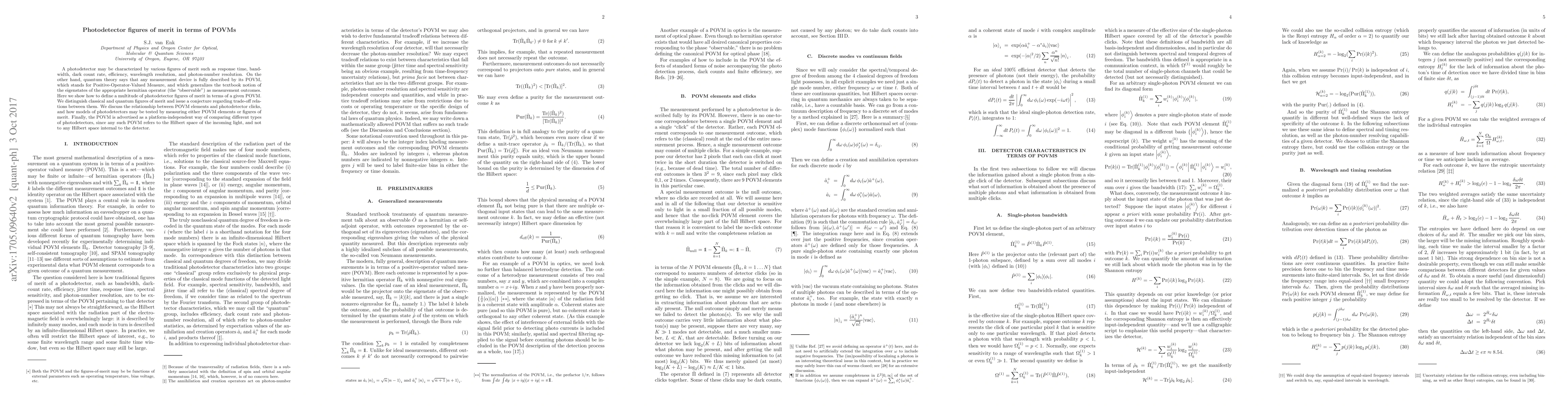 A photodetector may be characterized by various figures of merit such as response time, bandwidth, dark count rate, efficiency, wavelength resolution, and photon-number resolution. On the other hand, quantum theory says that any measurement device is fully described by its POVM, which stands for Positive-Operator-Valued Measure, and which generalizes the textbook notion of the eigenstates of the appropriate hermitian operator (the "observable") as measurement outcomes. Here we show how to define a multitude of photodetector figures of merit in terms of a given POVM. We distinguish classical and quantum figures of merit and issue a conjecture regarding trade-off relations between them. We discuss the relationship between POVM elements and photodetector clicks, and how models of photodetectors may be tested by measuring either POVM elements or figures of merit. Finally, the POVM is advertised as a platform-independent way of comparing different types of photodetectors, since any such POVM refers to the Hilbert space of the incoming light, and not to any Hilbert space internal to the detector.