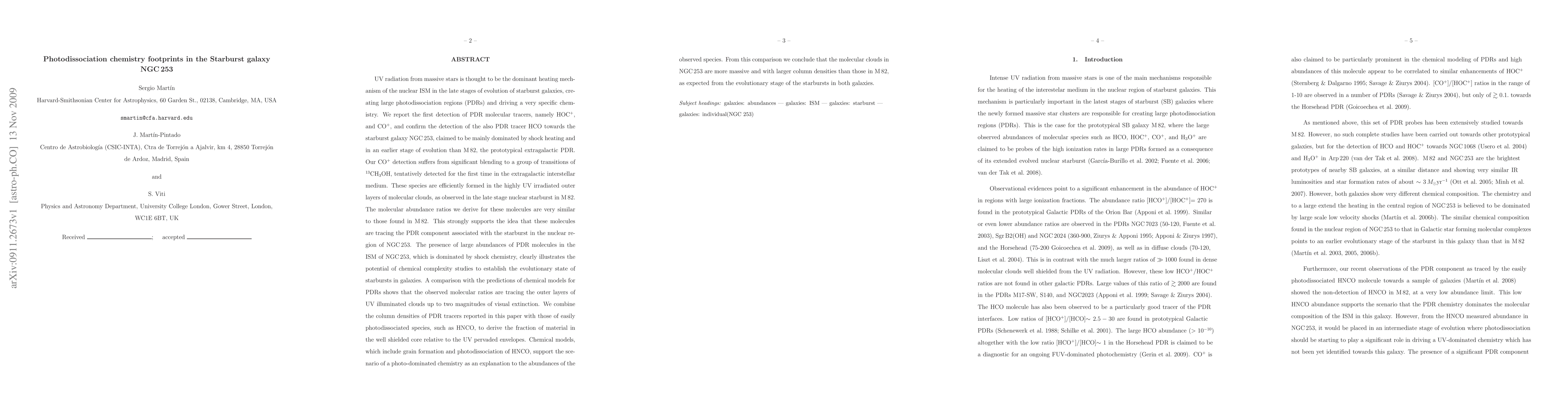 This study reports the first detection of PDR molecular tracers HOC+ and CO+ in the starburst galaxy NGC 253, confirming earlier findings of HCO+. The molecular abundance ratios are similar to those in the more evolved M 82, indicating that the observed species trace the photodissociation region (PDR) in NGC 253's starburst nucleus.