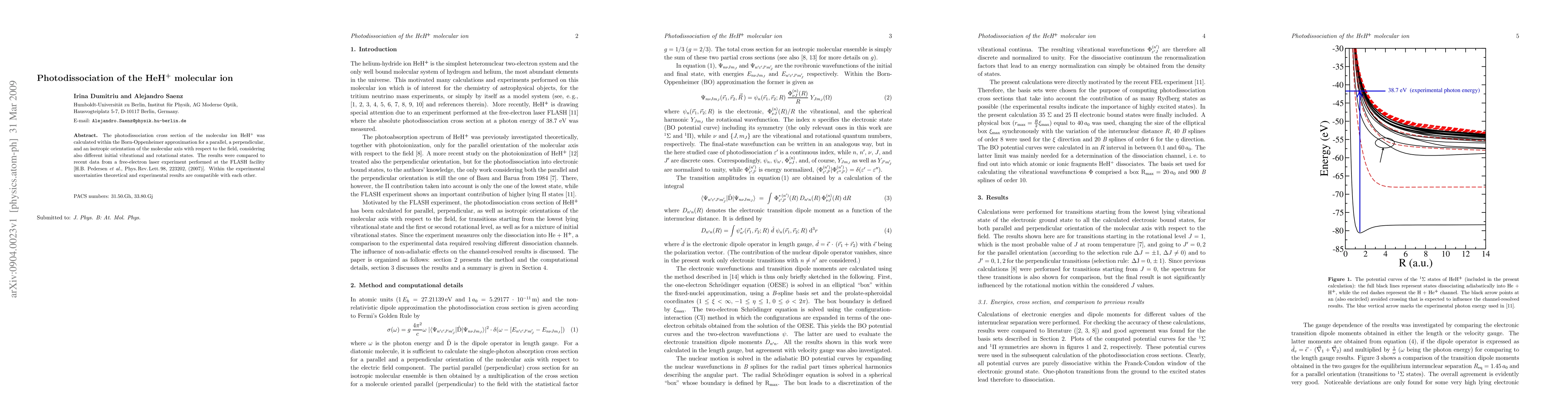 The research calculates HeH$^+$ molecular ion's photodissociation cross section via Born-Oppenheimer approximation for various molecular axis orientations and initial states. Theoretical results align with experimental data from FLASH facility within uncertainties, validating the methodology.