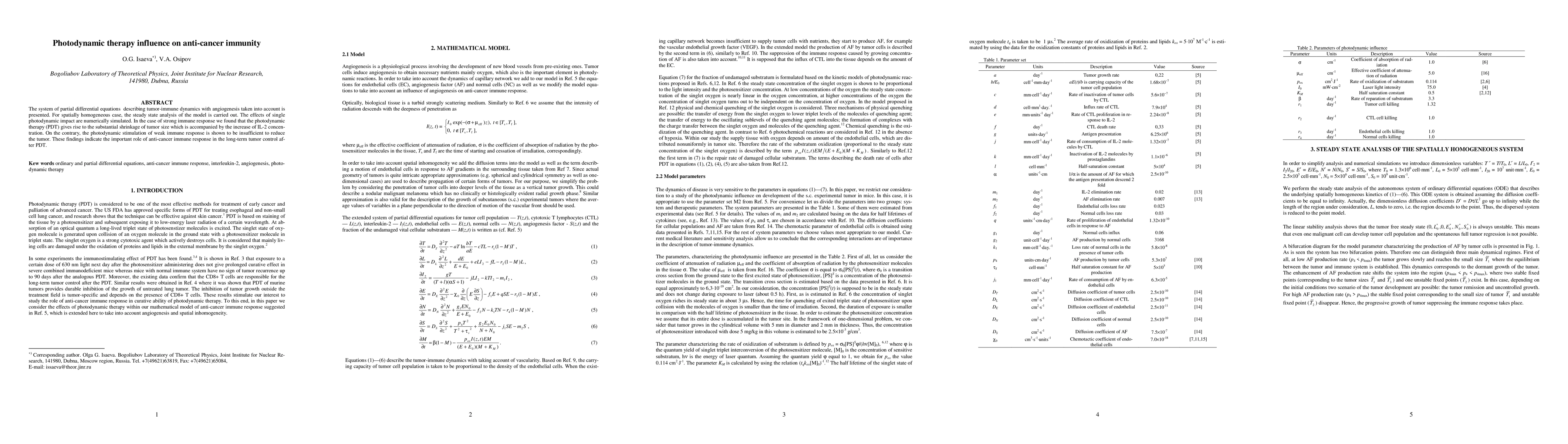 The system of partial differential equations describing tumor-immune dynamics with angiogenesis taken into account is presented. For spatially homogeneous case, the steady state analysis of the model is carried out. The effects of single photodynamic impact are numerically simulated. In the case of strong immune response we found that the photodynamic therapy (PDT) gives rise to the substantial shrinkage of tumor size which is accompanied by the increase of interleukin-2 concentration. On the contrary, the photodynamic stimulation of weak immune response is shown to be insufficient to reduce the tumor. These findings indicate the important role of anti-cancer immune response in the long-term tumor control after PDT.