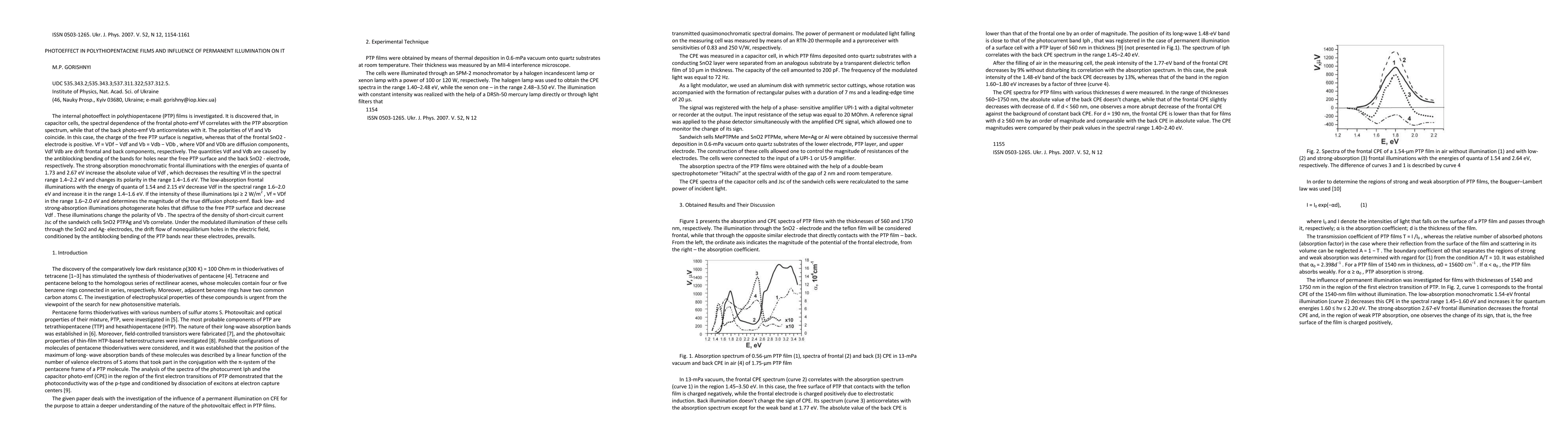 The internal photoeffect in polythiopentacene (PTP) films is investigated. It is discovered that, in capacitor cells, the spectral dependence of the frontal photo-emf Vf correlates with the PTP absorption spectrum, while that of the back photo-emf Vb anticorrelates with it. The polarities of Vf and Vb coincide. In this case, the charge of the free PTP surface is negative, whereas that of the frontal SnO2 electrode is positive. Back low- and strong-absorption illuminations photogenerate holes that diffuse to the free PTP surface and decrease Vdf . These illuminations change the polarity of Vb. The spectra of the density of short-circuit current Jsc of the sandwich cells SnO2 PTPAg and Vb correlate. Under the modulated illumination of these cells through the SnO2 and Ag electrodes, the drift flow of nonequilibrium holes in the electric field, conditioned by the antiblocking bending of the PTP bands near these electrodes, prevails.