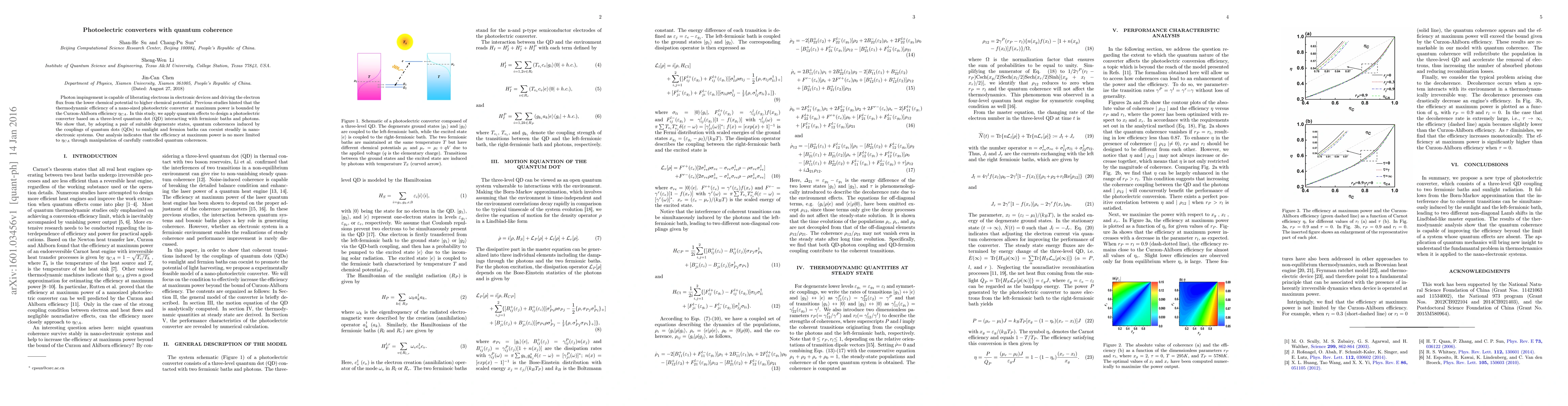 Photon impingement is capable of liberating electrons in electronic devices and driving the electron flux from the lower chemical potential to higher chemical potential. Previous studies hinted that the thermodynamic efficiency of a nano-sized photoelectric converter at maximum power is bounded by the Curzon-Ahlborn efficiency. In this study, we apply quantum effects to design a photoelectric converter based on a three-level quantum dot (QD) interacting with fermionic baths and photons. We show that, by adopting a pair of suitable degenerate states, quantum coherences induced by the couplings of quantum dots (QDs) to sunlight and fermion baths can coexist steadily in nano-electronic systems. Our analysis indicates that the efficiency at maximum power is no more limited to Curzon-Ahlborn efficiency through manipulation of carefully controlled quantum coherences.