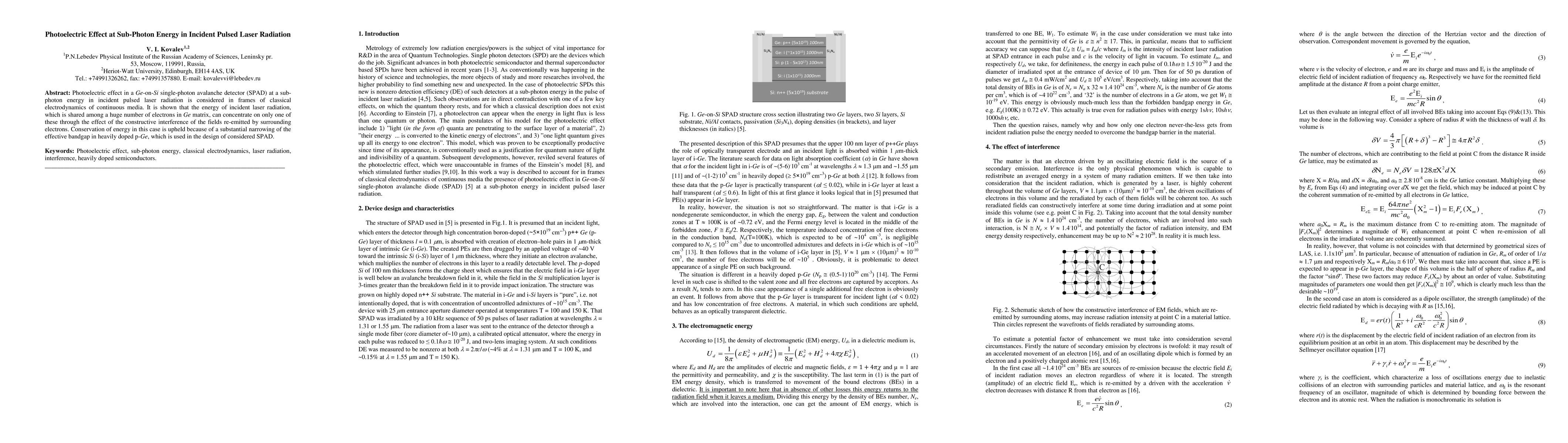 This paper explores the photoelectric effect in a Ge-on-Si SPAD at sub-photon energy levels, demonstrating how energy from incident laser radiation can concentrate on a single electron through constructive interference, with energy conservation maintained by a narrowed effective bandgap in heavily doped p-Ge.