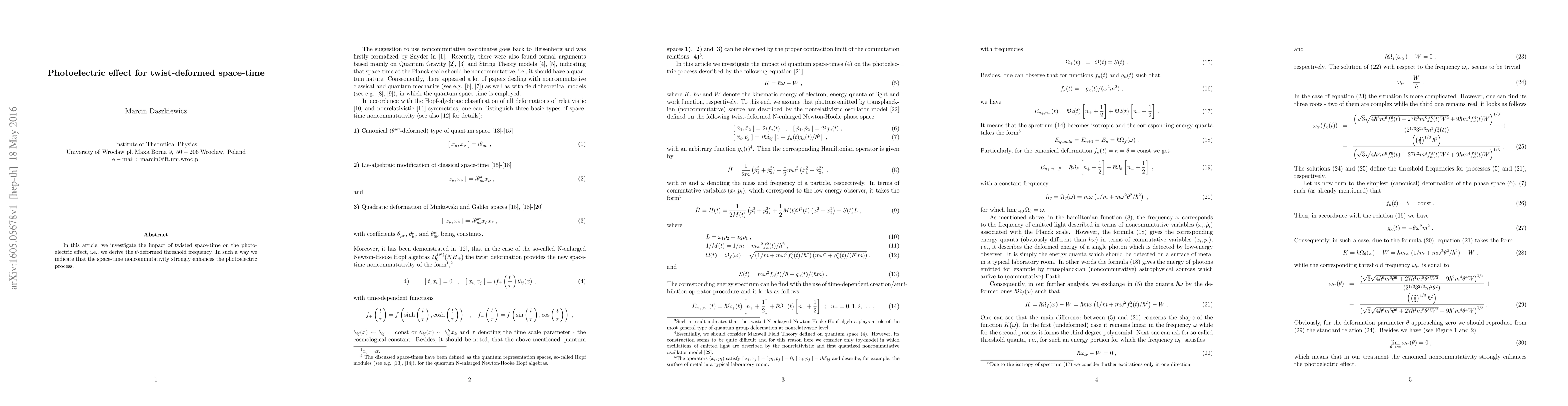 This paper explores how twisted space-time influences the photoelectric effect, deriving a $\theta$-deformed threshold frequency and demonstrating that space-time noncommutativity significantly enhances the photoelectric process.