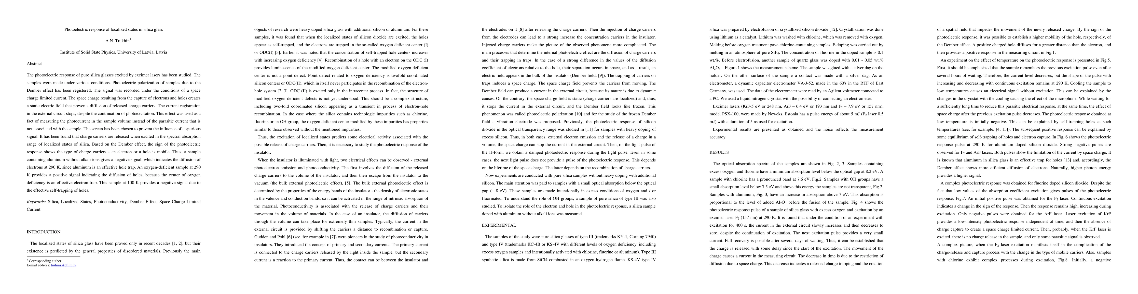 The photoelectric response of pure silica glasses excited by excimer lasers has been studied. The samples were made under various conditions. Photoelectric polarization of samples due to the Dember effect has been registered. The signal was recorded under the conditions of a space charge limited current. The space charge resulting from the capture of electrons and holes creates a static electric field that prevents diffusion of released charge carriers. The current registration in the external circuit stops, despite the continuation of photoexcitation. This effect was used as a fact of measuring the photocurrent in the sample volume instead of the parasitic current that is not associated with the sample. The screen has been chosen to prevent the influence of a spurious signal. It has been found that charge carriers are released when excited in the spectral absorption range of localized states of silica. Based on the Dember effect, the sign of the photoelectric response shows the type of charge carriers - an electron or a hole is mobile. Thus, a sample containing aluminum without alkali ions gives a negative signal, which indicates the diffusion of electrons at 290 K, since aluminum is an effective hole trap. An oxygen-deficient sample at 290 K provides a positive signal indicating the diffusion of holes, because the center of oxygen deficiency is an effective electron trap. This sample at 100 K provides a negative signal due to the effective self-trapping of holes.