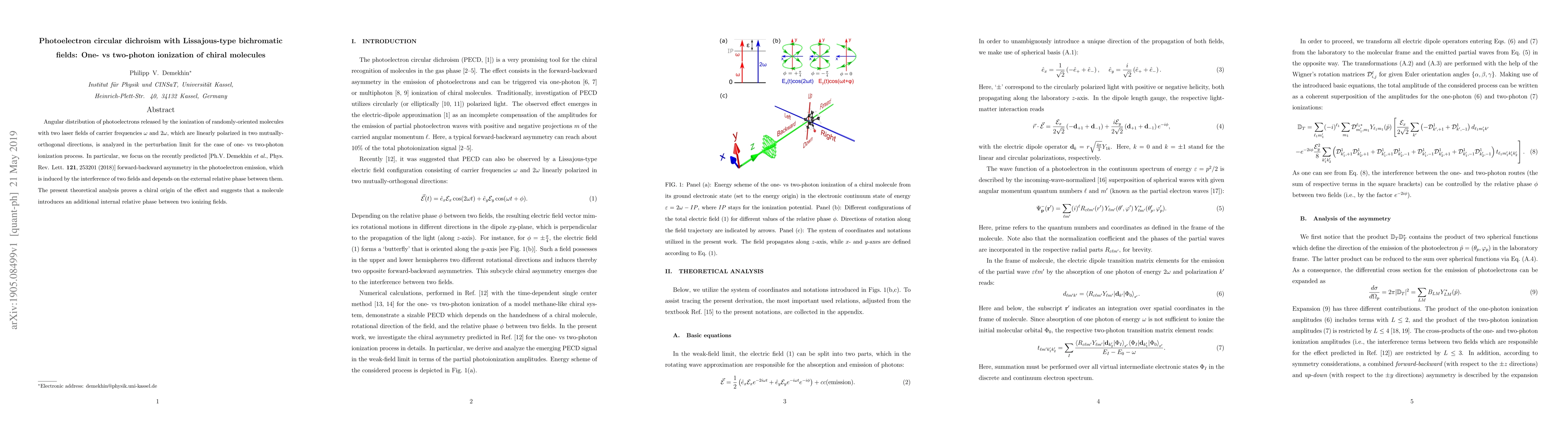 Angular distribution of photoelectrons released by the ionization of randomly-oriented molecules with two laser fields of carrier frequencies $\omega$ and $2\omega$, which are linearly polarized in two mutually-orthogonal directions, is analyzed in the perturbation limit for the case of one- vs two-photon ionization process. In particular, we focus on the recently predicted [Ph.V. Demekhin {\it et al.}, Phys. Rev. Lett. \textbf{121}, 253201 (2018)] forward-backward asymmetry in the photoelectron emission, which is induced by the interference of two fields and depends on the external relative phase between them. The present theoretical analysis proves a chiral origin of the effect and suggests that a molecule introduces an additional internal relative phase between two ionizing fields.