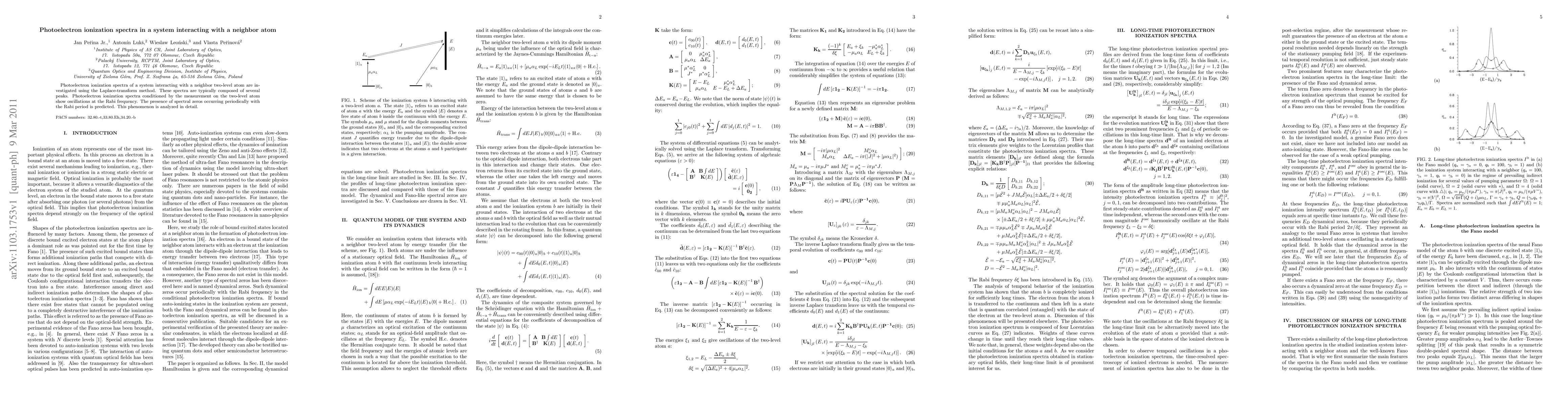 This paper investigates photoelectron ionization spectra in a system interacting with a neighboring two-level atom, revealing oscillations at the Rabi frequency and predicting periodic spectral zeros occurring with the Rabi period, using the Laplace-transform method. The detailed analysis provides insights into the spectral behavior influenced by the interaction.