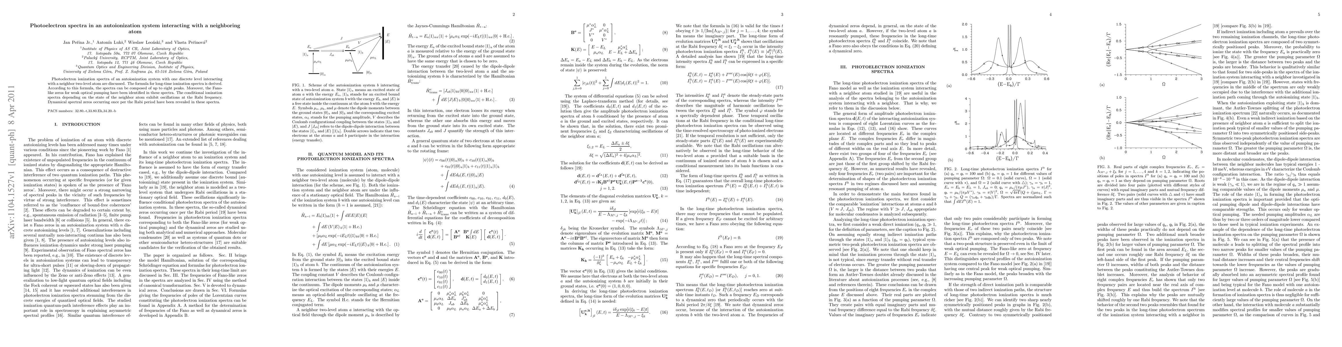This paper derives a formula for long-time ionization spectra in an autoionization system interacting with a neighboring two-level atom, revealing up to eight peaks and identifying Fano-like zeros under weak optical pumping. It also highlights oscillations in conditional ionization spectra at the Rabi frequency and reveals dynamical spectral zeros occurring once per Rabi period.