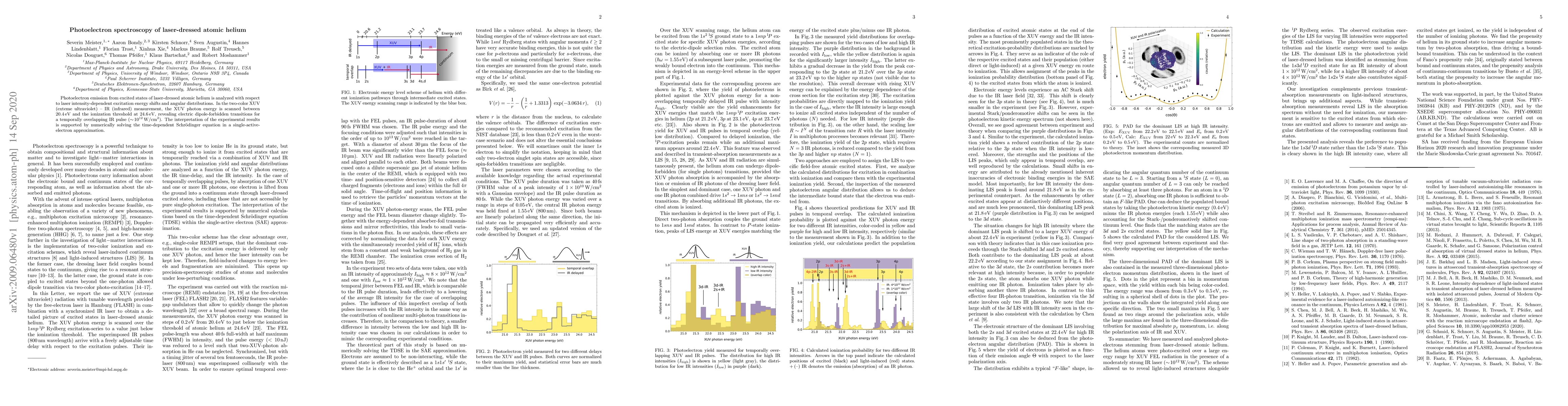 The study utilizes photoelectron spectroscopy with laser-dressed atomic helium, employing two-color XUV (extreme ultra-violet) -- IR (infrared) radiation. The time-dependent Schrödinger equation (TDSE) is numerically solved in a single-active-electron (SAE) approximation to interpret experimental results.