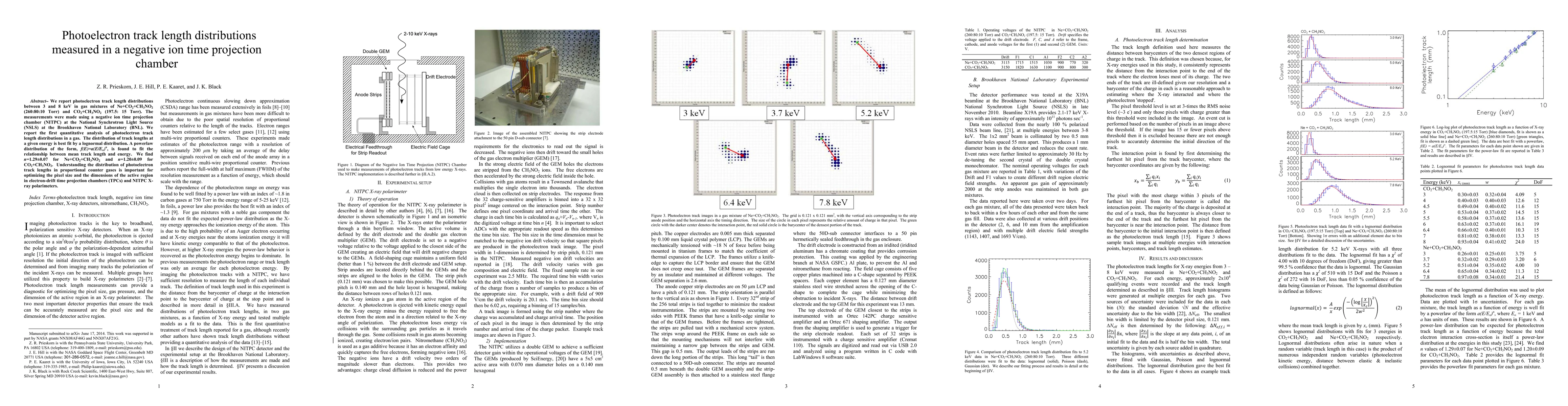 This research presents the first quantitative analysis of photoelectron track length distributions in gas mixtures using a negative ion time projection chamber (NITPC). The study finds that the distribution of track lengths at a given energy follows a lognormal distribution, while the relationship between mean track length and energy is best fit by a powerlaw distribution with exponents n=1.29 +/- 0.07 for Ne+CO2+CH3NO2 and n=1.20 +/- 0.09 for CO2+CH3NO2. These findings are crucial for optimizing the design of electron-drift time projection chambers (TPCs) and NITPC X-ray polarimeters.
