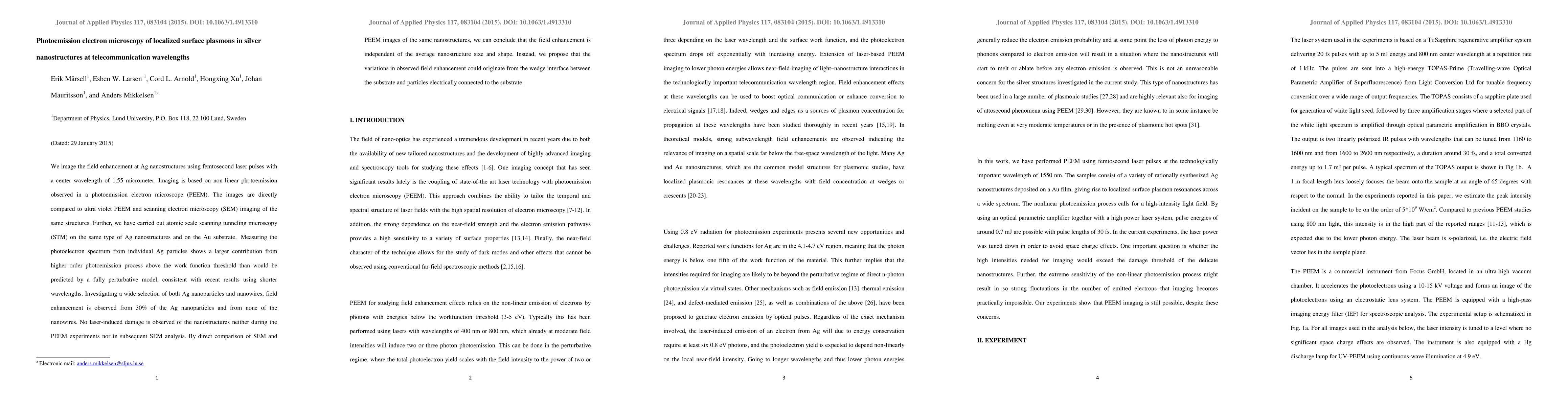 This study uses photoemission electron microscopy (PEEM) to image field enhancement in silver nanostructures at 1.55 micrometer wavelengths, revealing that field enhancement is not dependent on average size or shape but likely due to the wedge interface between the substrate and electrically connected particles. No laser-induced damage was observed in the nanostructures during experiments.