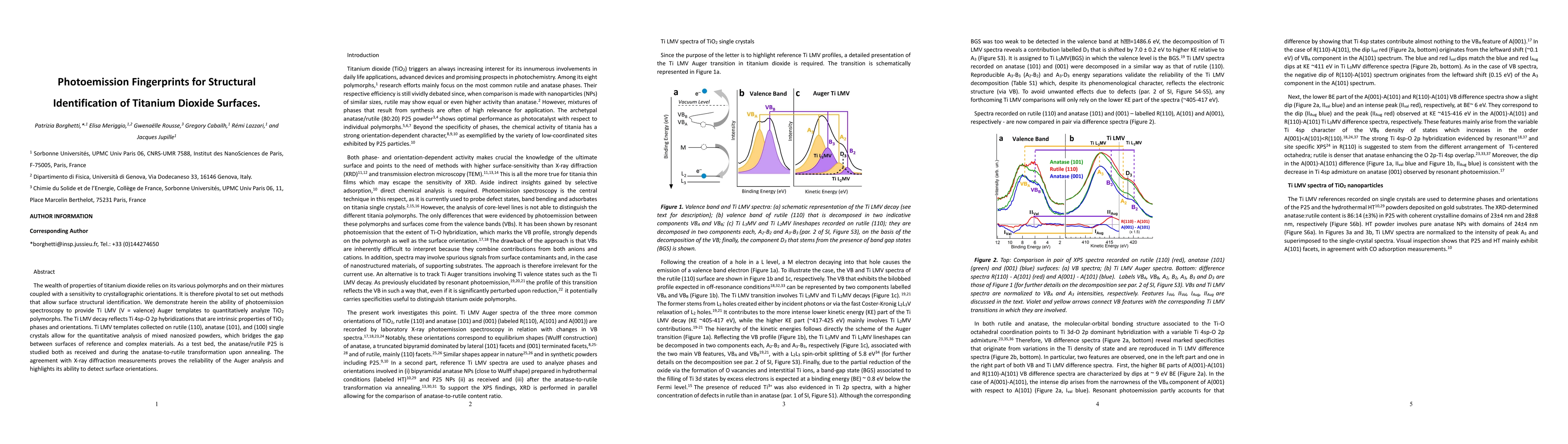 This paper demonstrates the use of photoemission spectroscopy to identify structural properties of titanium dioxide (TiO$_2$) surfaces through Ti LMV Auger templates, showing the method's effectiveness in analyzing TiO$_2$ polymorphs and their orientations, validated by comparing with X-ray diffraction measurements.