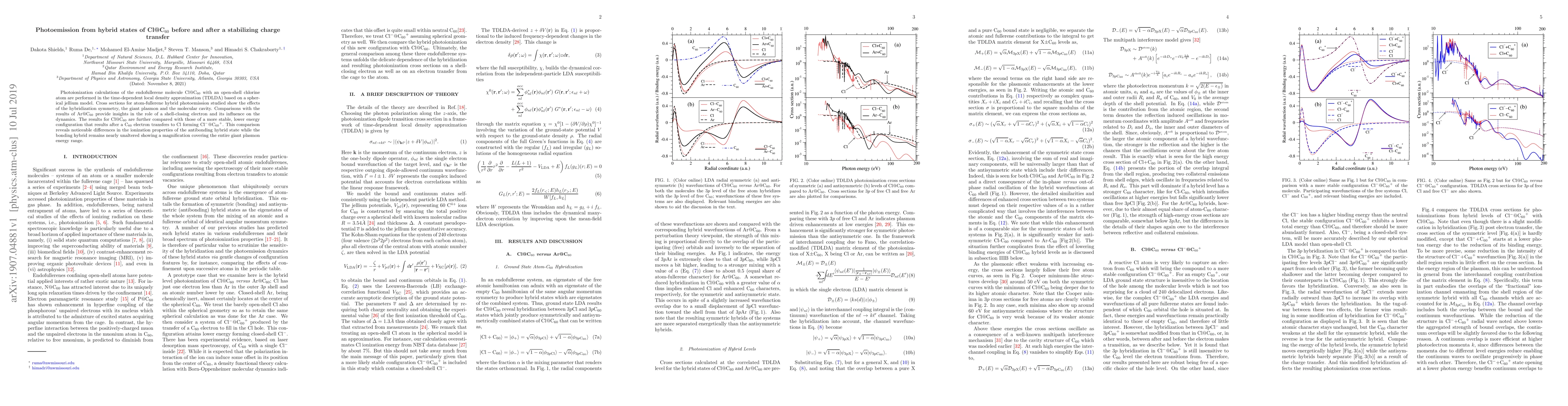 This study investigates the photoemission cross sections of Cl@$C_{60}$ using TDLDA, highlighting the influence of electron hybridization and plasmon effects. Comparisons before and after a stabilizing charge transfer to form Cl$^-$@$C_{60}^+$ reveal significant changes in ionization properties for the antibonding hybrid state.