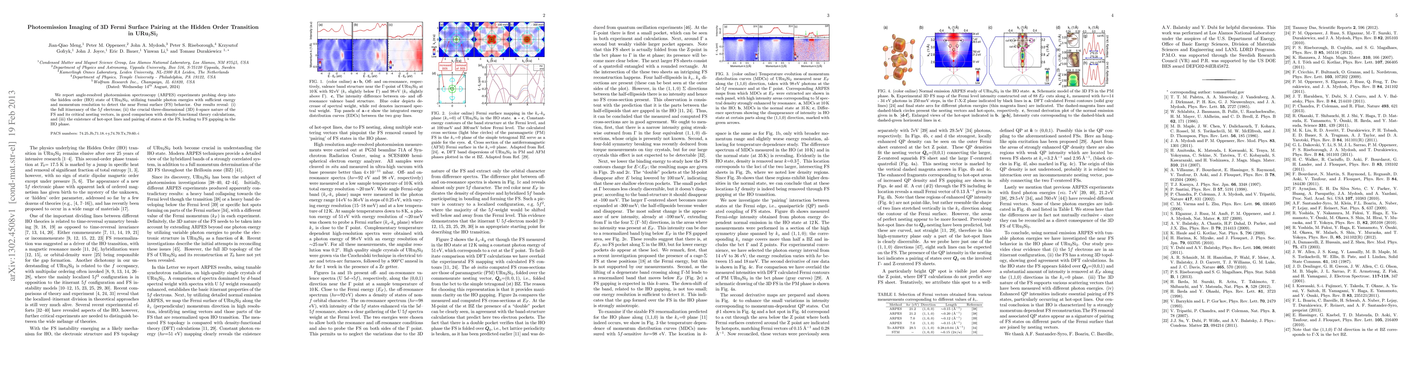 This study uses ARPES to investigate the hidden order state in URu2Si2, revealing the full itinerancy of 5f electrons, the three-dimensional nature of the Fermi surface, and the presence of hot-spot pairing and gapping at the Fermi surface during the transition to the hidden order phase.