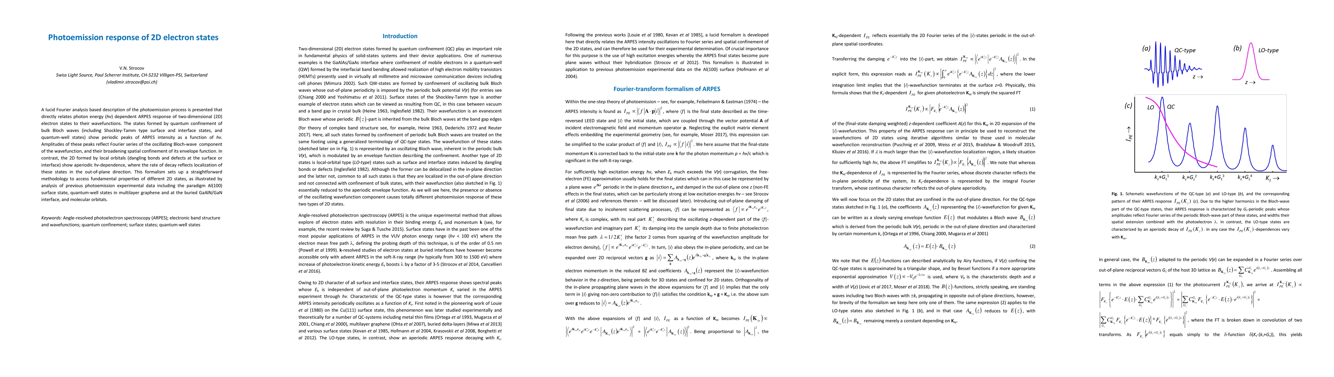 A lucid Fourier analysis based description of the photoemission process is presented that directly relates photon energy (hv) dependent ARPES response of two-dimensional (2D) electron states to their wavefunctions. The states formed by quantum confinement of bulk Bloch waves (including Shockley-Tamm type surface and interface states, and quantum-well states) show periodic peaks of ARPES intensity as a function of hv. Amplitudes of these peaks reflect Fourier series of the oscillating Bloch-wave component of the wavefunction, and their broadening spatial confinement of its envelope function. In contrast, the 2D formed by local orbitals (dangling bonds and defects at the surface or interface) show aperiodic hv-dependence, where the rate of decay reflects localization of these states in the out-of-plane direction. This formalism sets up a straightforward methodology to access fundamental properties of different 2D states, as illustrated by analysis of previous photoemission experimental data including the paradigm Al(100) surface state, quantum-well states in multilayer graphene and at the buried GaAlN/GaN interface, and molecular orbitals.