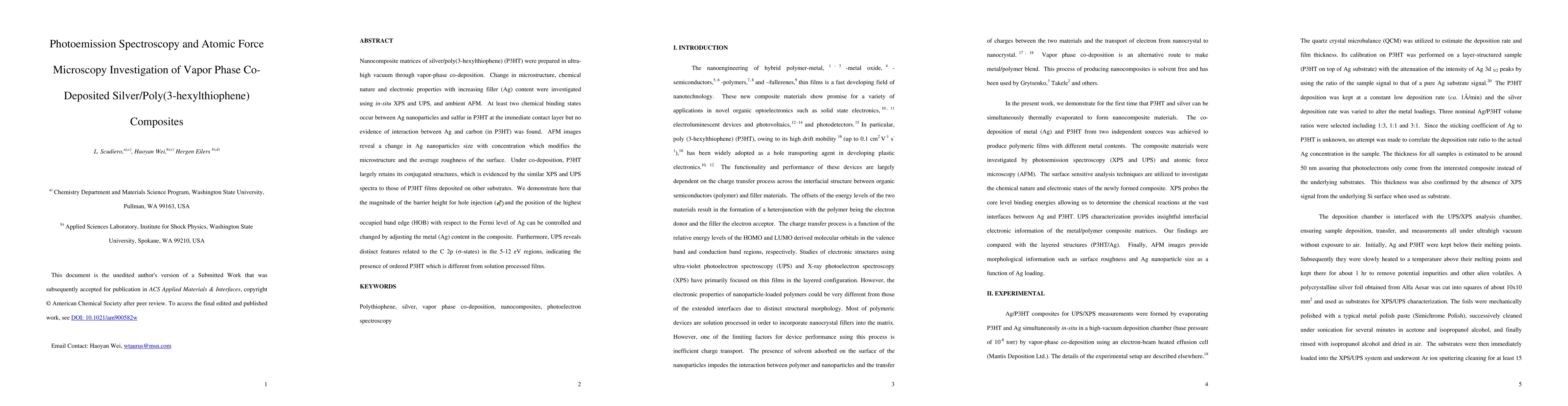 Nanocomposite matrices of silver/poly(3-hexylthiophene) (P3HT) were prepared in ultrahigh vacuum through vapor-phase co-deposition. Change in microstructure, chemical nature and electronic properties with increasing filler (Ag) content were investigated using in-situ XPS and UPS, and ambient AFM. At least two chemical binding states occur between Ag nanoparticles and sulfur in P3HT at the immediate contact layer but no evidence of interaction between Ag and carbon (in P3HT) was found. AFM images reveal a change in Ag nanoparticles size with concentration which modifies the microstructure and the average roughness of the surface. Under co-deposition, P3HT largely retains its conjugated structures, which is evidenced by the similar XPS and UPS spectra to those of P3HT films deposited on other substrates. We demonstrate here that the magnitude of the barrier height for hole injection and the position of the highest occupied band edge (HOB) with respect to the Fermi level of Ag can be controlled and changed by adjusting the metal (Ag) content in the composite. Furthermore, UPS reveals distinct features related to the C 2p (Sigma states) in the 5-12 eV regions, indicating the presence of ordered P3HT which is different from solution processed films.