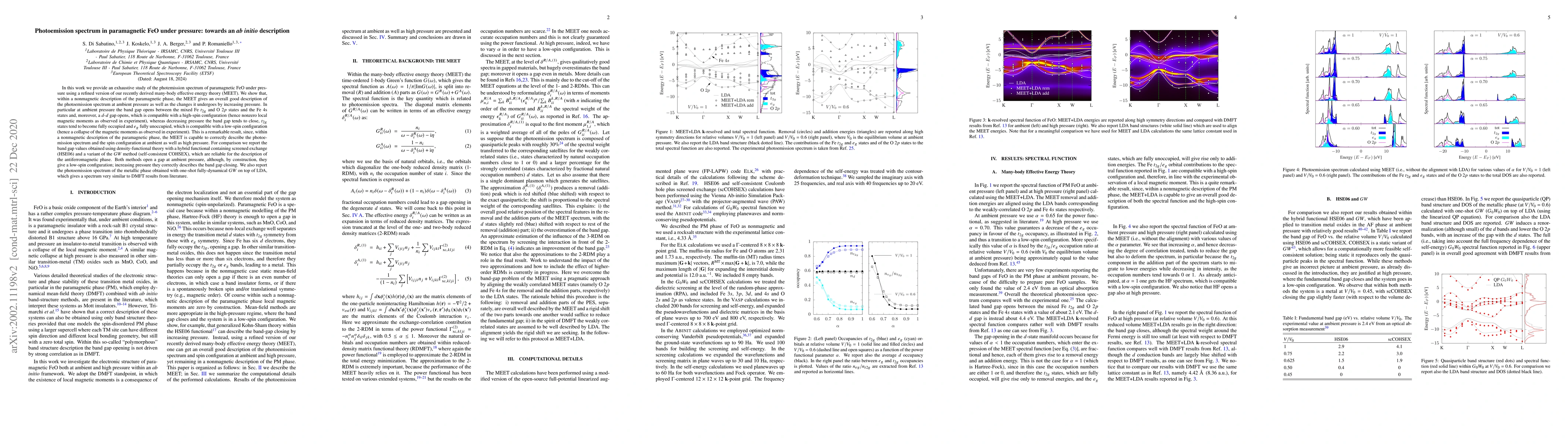In this work we provide an exhaustive study of the photemission spectrum of paramagnetic FeO under pressure using a refined version of our recently derived many-body effective energy theory (MEET). We show that, within a nonmagnetic description of the paramagnetic phase, the MEET gives an overall good description of the photoemission spectrum at ambient pressure as well as the changes it undergoes by increasing pressure. In particular at ambient pressure the band gap opens between the mixed Fe $t_{2g}$ and O $2p$ states and the Fe 4s states and, moreover, a $d$-$d$ gap opens, which is compatible with a high-spin configuration (hence nonzero local magnetic moments as observed in experiment), whereas decreasing pressure the band gap tends to close, $t_{2g}$ states tend to become fully occupied and $e_{g}$ fully unoccupied, which is compatible with a low-spin configuration (hence a collapse of the magnetic moments as observed in experiment). This is a remarkable result, since, within a nonmagnetic description of the paramagnetic phase, the MEET is capable to correctly describe the photoemission spectrum and the spin configuration at ambient as well as high pressure. For comparison we report the band gap values obtained using density-functional theory with a hybrid functional containing screened exchange (HSE06) and a variant of the $GW$ method (self-consistent COHSEX), which are reliable for the description of the antiferromagnetic phase. Both methods open a gap at ambient pressure, although, by construction, they give a low-spin configuration; increasing pressure they correctly describes the band gap closing. We also report the photoemission spectrum of the metallic phase obtained with one-shot fully-dynamical $GW$ on top of LDA, which gives a spectrum very similar to DMFT results from literature.