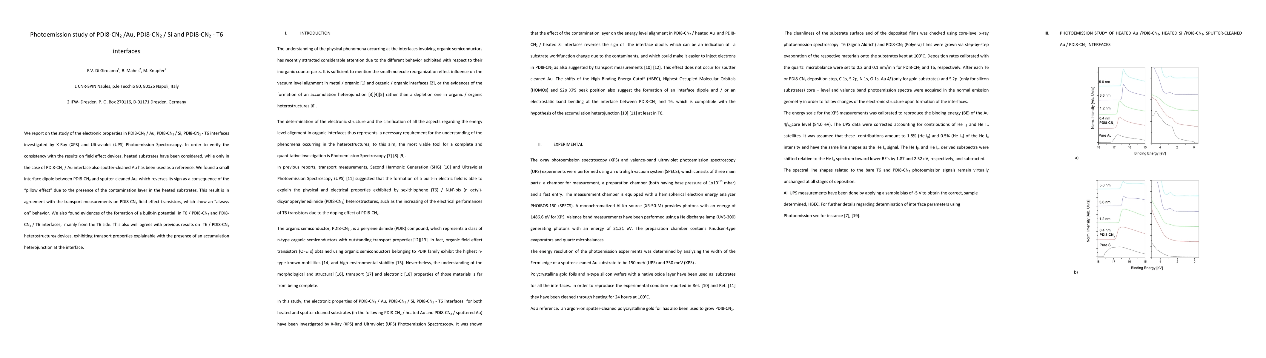 We report on the study of the electronic properties in PDI8-CN2 / Au, PDI8-CN2 / Si, PDI8-CN2 - T6 interfaces investigated by X-Ray (XPS) and Ultraviolet (UPS) Photoemission Spectroscopy. In order to verify the consistency with the results on field effect devices, heated substrates have been considered, while only in the case of PDI8-CN2 / Au interface also sputter-cleaned Au has been used as a reference. We found a small interface dipole between PDI8-CN2 and sputter-cleaned Au, which reverses its sign as a consequence of the 'pillow effect' due to the presence of the contamination layer in the heated substrates. This result is in agreement with the transport measurements on PDI8-CN2 field effect transistors, which show an 'always on' behavior. We also found evidences of the formation of a built-in potential in T6 / PDI8-CN2 and PDI8-CN2 / T6 interfaces, mainly from the T6 side. This also well agrees with previous results on T6 / PDI8-CN2 heterostructures devices, exhibiting transport properties explainable with the presence of an accumulation heterojunction at the interface.