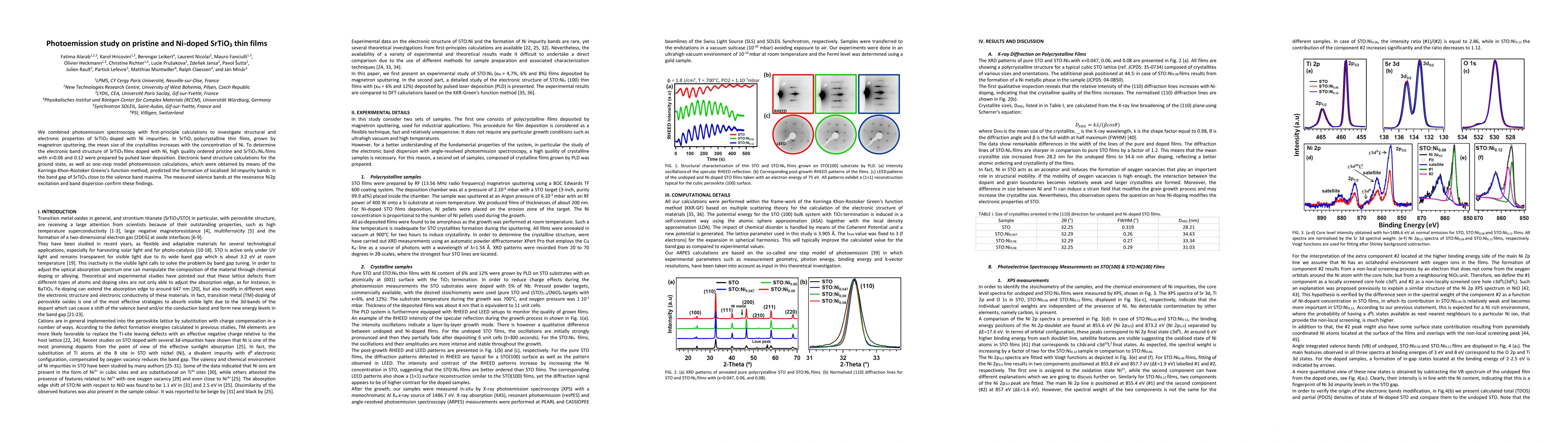 We combined photoelemission spectroscopy with first-principle calculations to investigate structural and electronic properties of SrTiO$_{3}$ doped with Ni impurities. In SrTiO$_{3}$ polycrystalline thin films, grown by magnetron sputtering, the mean size of the crystallites increases with the concentration of Ni. To determine the electronic band structure of SrTiO$_{3}$ films doped with Ni, high quality ordered pristine and SrTiO3:Ni$_{x}$ films with x=0.06 and 0.12 were prepared by pulsed laser deposition. Electronic band structure calculations for the ground state, as well as one-step model photoemission calculations, which were obtained by means of the Korringa-Khon-Rostoker Greens's function method, predicted the formation of localised $3d$-impurity bands in the band gap of SrTiO$_{3}$ close to the valence band maxima. The measured valence bands at the resonance Ni2p excitation and band dispersion confirm these findings.