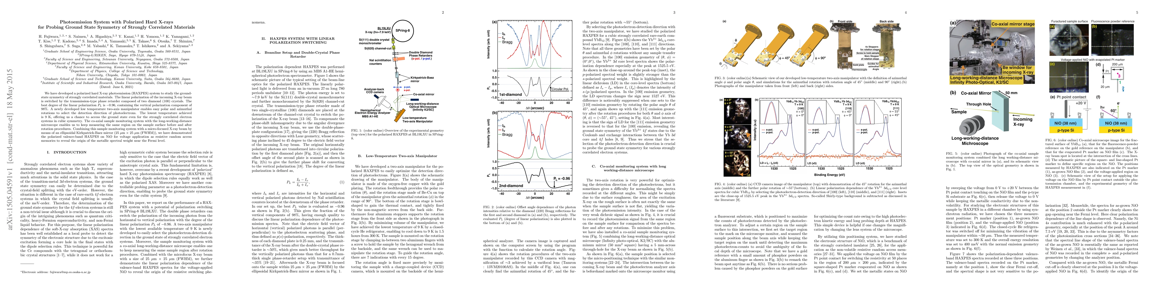 We have developed a polarized hard X-ray photoemission (HAXPES) system to study the ground-state symmetry of strongly correlated materials. The linear polarization of the incoming X-ray beam is switched by the transmission-type phase retarder composed of two diamond (100) crystals. The best degree of the linear polarization $P_L$ is $-0.96$, containing the vertical polarization component of 98%. A newly developed low temperature two-axis manipulator enables easy polar and azimuthal rotations to select the detection direction of photoelectrons. The lowest temperature achieved is 9 K, offering us a chance to access the ground state even for the strongly correlated electron systems in cubic symmetry. The co-axial sample monitoring system with the long-working-distance microscope enables us to keep measuring the same region on the sample surface before and after rotation procedures. Combining this sample monitoring system with a micro-focused X-ray beam by means of an ellipsoidal Kirkpatrick-Baez mirror (25 $\mu$m $\times$ 25 $\mu$m (FWHM)), we have demonstrated the polarized valence-band HAXPES on NiO for voltage application as resistive random access memories to reveal the origin of the metallic spectral weight near the Fermi level.