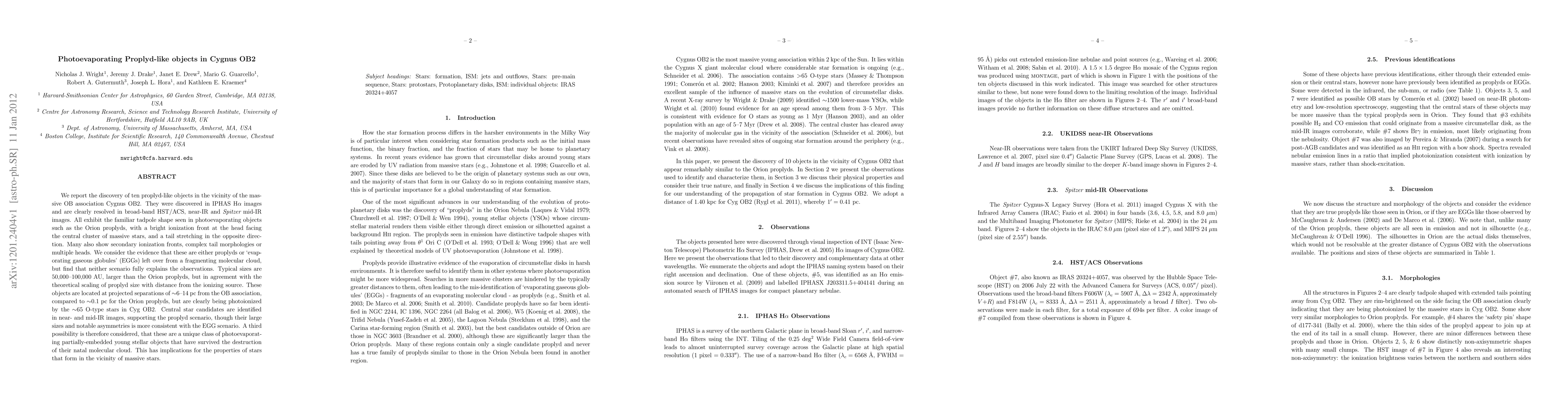 We report the discovery of ten proplyd-like objects in the vicinity of the massive OB association Cygnus OB2. They were discovered in IPHAS H-Alpha images and are clearly resolved in broad-band HST/ACS, near-IR and Spitzer mid-IR images. All exhibit the familiar tadpole shape seen in photoevaporating objects such as the Orion proplyds, with a bright ionization front at the head facing the central cluster of massive stars, and a tail stretching in the opposite direction. Many also show secondary ionization fronts, complex tail morphologies or multiple heads. We consider the evidence that these are either proplyds or `evaporating gaseous globules' (EGGs) left over from a fragmenting molecular cloud, but find that neither scenario fully explains the observations. Typical sizes are 50,000--100,000 AU, larger than the Orion proplyds, but in agreement with the theoretical scaling of proplyd size with distance from the ionizing source. These objects are located at projected separations of 6-14pc from the OB association, compared to 0.1pc for the Orion proplyds, but are clearly being photoionized by the 65 O-type stars in Cyg OB2. Central star candidates are identified in near- and mid-IR images, supporting the proplyd scenario, though their large sizes and notable asymmetries is more consistent with the EGG scenario. A third possibility is therefore considered, that these are a unique class of photoevaporating partially-embedded young stellar objects that have survived the destruction of their natal molecular cloud. This has implications for the properties of stars that form in the vicinity of massive stars.
