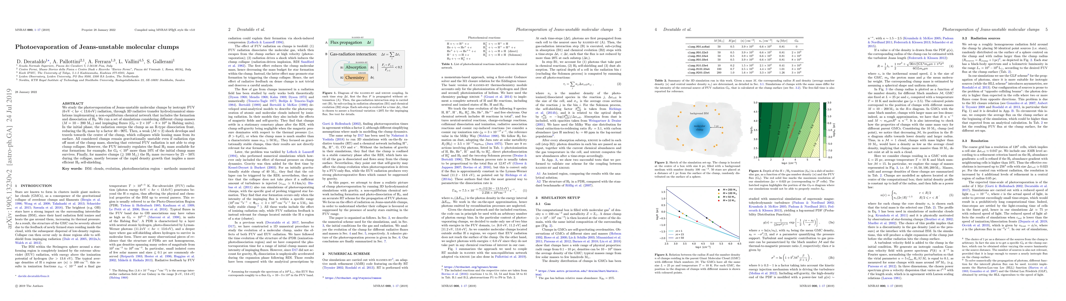 We study the photoevaporation of Jeans-unstable molecular clumps by isotropic FUV (6 eV $< {\rm h}\nu$ < 13.6 eV) radiation, through 3D radiative transfer hydrodynamical simulations implementing a non-equilibrium chemical network that includes the formation and dissociation of H$_2$. We run a set of simulations considering different clump masses ($M=10-200$ M$_\odot$) and impinging fluxes ($G_0=2\times 10^3-8\times 10^4$ in Habing units). In the initial phase, the radiation sweeps the clump as an R-type dissociation front, reducing the H$_2$ mass by a factor 40-90%. Then, a weak ($\mathcal{M}\simeq 2$) shock develops and travels towards the centre of the clump, which collapses while loosing mass from its surface. All considered clumps remain gravitationally unstable even if radiation rips off most of the clump mass, showing that external FUV radiation is not able to stop clump collapse. However, the FUV intensity regulates the final H$_2$ mass available for star formation: for example, for $G_0 < 10^4$ more than 10% of the initial clump mass survives. Finally, for massive clumps ($\sim 100$ M$_\odot$) the H$_2$ mass increases by 25-50% during the collapse, mostly because of the rapid density growth that implies a more efficient H$_2$ self-shielding.