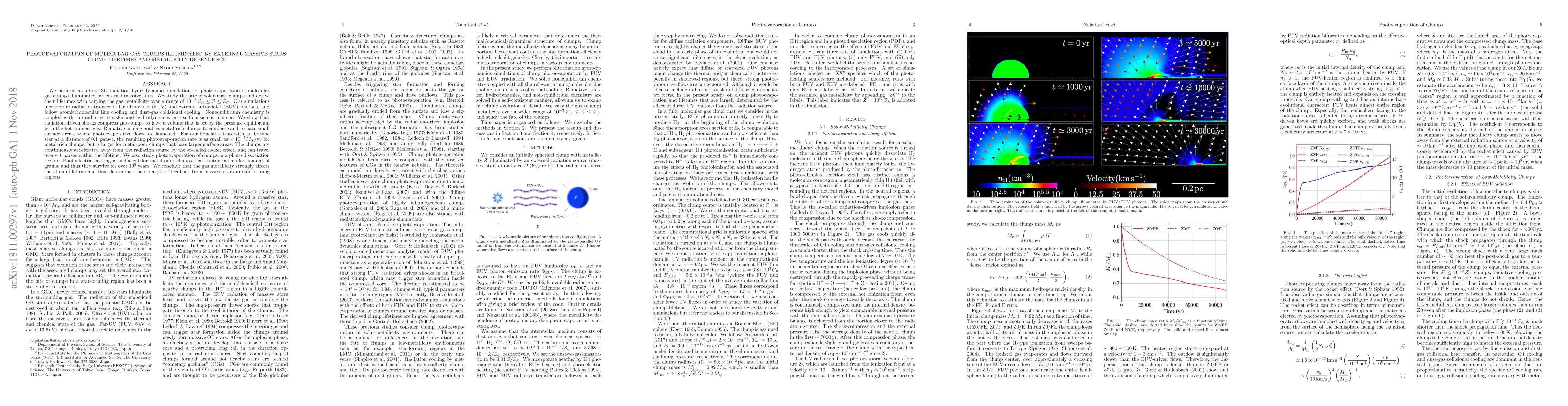The research uses 3D simulations to study how the metallicity of molecular gas clumps affects their survival under radiation from massive stars. Key findings include that metal-rich clumps can condense and have smaller surface areas, leading to slower photoevaporation rates. Clumps can travel up to 1 parsec due to the 'rocket effect'. Metal-poor clumps survive longer, over 10^5 years, due to less photoelectric heating. The study concludes that gas metallicity significantly influences clump lifetimes and the feedback from massive stars in star-forming regions.
