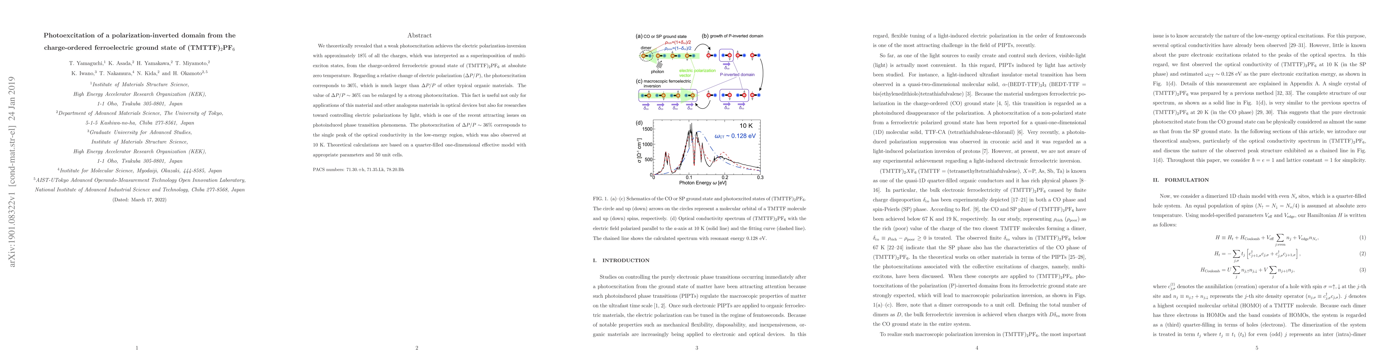 We theoretically revealed that a weak photoexcitation achieves the electric polarization-inversion with approximately $18\%$ of all the charges, which was interpreted as a superimposition of multi-exciton states, from the charge-ordered ferroelectric ground state of (TMTTF)$_{2}$PF$_{6}$ at absolute zero temperature. Regarding a relative change of electric polarization ($\Delta P/P$), the photoexcitation corresponds to $36\%$, which is much larger than $\Delta P/P$ of other typical organic materials. The value of $\Delta P/P\sim 36\%$ can be enlarged by a strong photoexcitation. This fact is useful not only for applications of this material and other analogous materials in optical devices but also for researches toward controlling electric polarizations by light, which is one of the recent attracting issues on photoinduced phase transition phenomena. The photoexcitation of $\Delta P/P\sim 36\%$ corresponds to the single peak of the optical conductivity in the low-energy region, which was also observed at 10 K. Theoretical calculations are based on a quarter-filled one-dimensional effective model with appropriate parameters and 50 unit cells.
