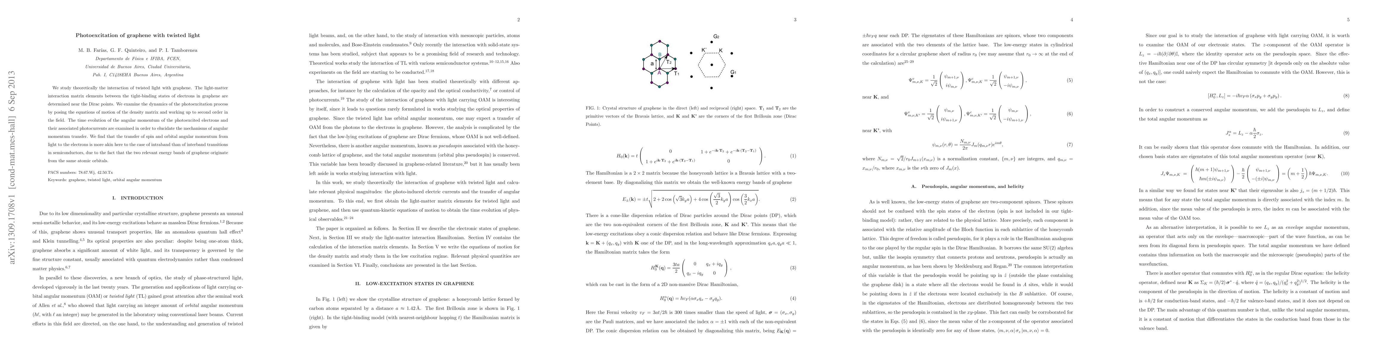 We study theoretically the interaction of twisted light with graphene. The light-matter interaction matrix elements between the tight-binding states of electrons in graphene are determined near the Dirac points. We examine the dynamics of the photoexcitation process by posing the equations of motion of the density matrix and working up to second order in the field. The time evolution of the angular momentum of the photoexcited electrons and their associated photocurrents are examined in order to elucidate the mechanisms of angular momentum transfer. We find that the transfer of spin and orbital angular momentum from light to the electrons is more akin here to the case of intraband than of interband transitions in semiconductors, due to the fact that the two relevant energy bands of graphene originate from the same atomic orbitals.