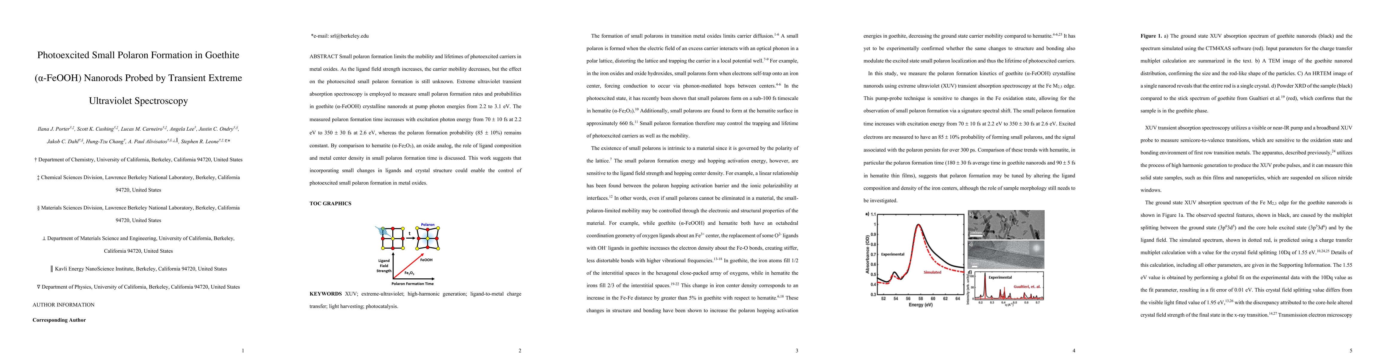 This study uses extreme ultraviolet transient absorption spectroscopy to investigate small polaron formation in goethite nanorods, revealing that polaron formation time increases with higher excitation energy while the probability remains constant. The findings suggest that ligand composition and metal center density influence small polaron formation, indicating potential for controlling these properties in metal oxides.