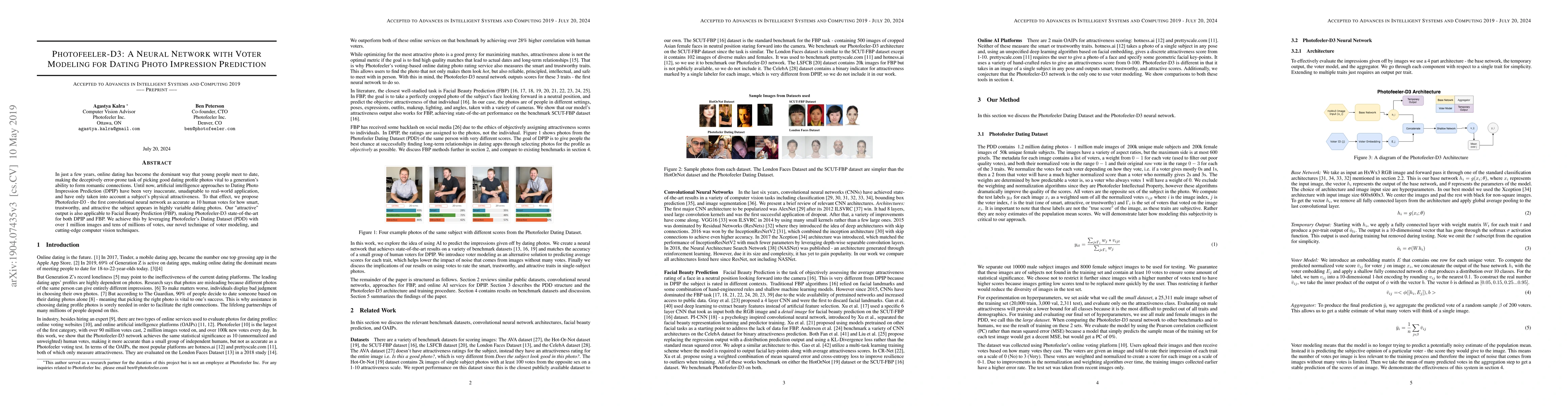 In just a few years, online dating has become the dominant way that young people meet to date, making the deceptively error-prone task of picking good dating profile photos vital to a generation's ability to form romantic connections. Until now, artificial intelligence approaches to Dating Photo Impression Prediction (DPIP) have been very inaccurate, unadaptable to real-world application, and have only taken into account a subject's physical attractiveness. To that effect, we propose Photofeeler-D3 - the first convolutional neural network as accurate as 10 human votes for how smart, trustworthy, and attractive the subject appears in highly variable dating photos. Our "attractive" output is also applicable to Facial Beauty Prediction (FBP), making Photofeeler-D3 state-of-the-art for both DPIP and FBP. We achieve this by leveraging Photofeeler's Dating Dataset (PDD) with over 1 million images and tens of millions of votes, our novel technique of voter modeling, and cutting-edge computer vision techniques.