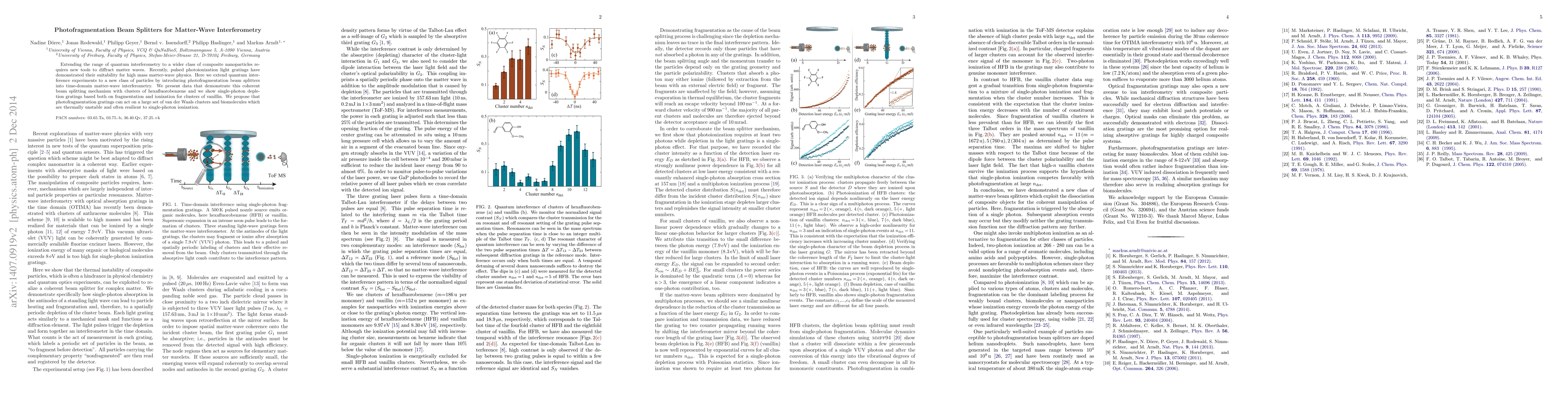 The development and demonstration of photofragmentation beam splitters for coherent matter-wave manipulation, providing a novel approach to time-domain interferometry with thermally unstable clusters and biomolecules.