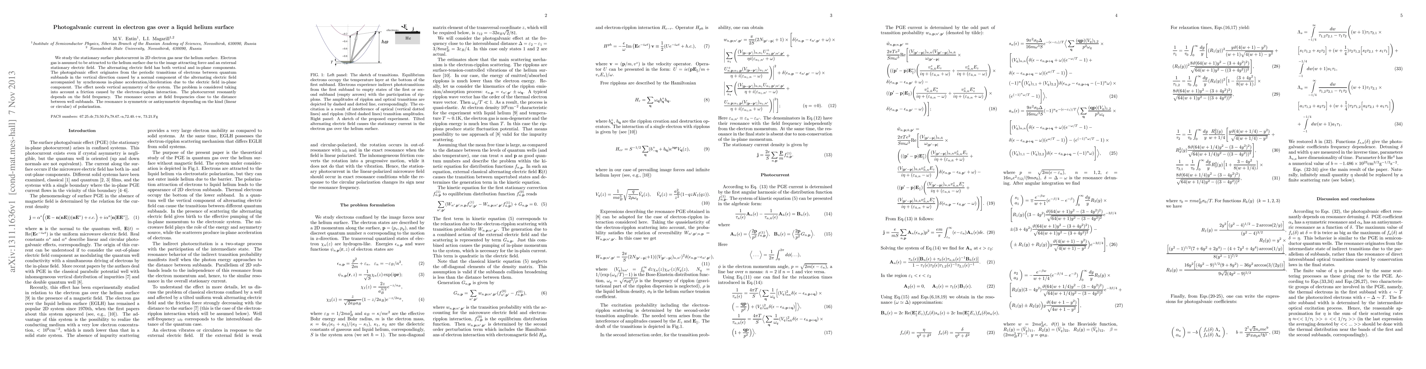 We study the stationary surface photocurrent in 2D electron gas near the helium surface. Electron gas is assumed to be attracted to the helium surface due to the image attracting force and an external stationary electric field. The alternating electric field has both vertical and in-plane components. The photogalvanic effect originates from the periodic transitions of electrons between quantum subbands in the vertical direction caused by a normal component of the alternating electric field accompanied by synchronous in-plane acceleration/deceleration due to the electric field in-plane component. The effect needs vertical asymmetry of the system. The problem is considered taking into account a friction caused by the electron-ripplon interaction. The photocurrent resonantly depends on the field frequency. The resonance occurs at field frequencies close to the distance between well subbands. The resonance is symmetric or antisymmetric depending on the kind (linear or circular) of polarization.