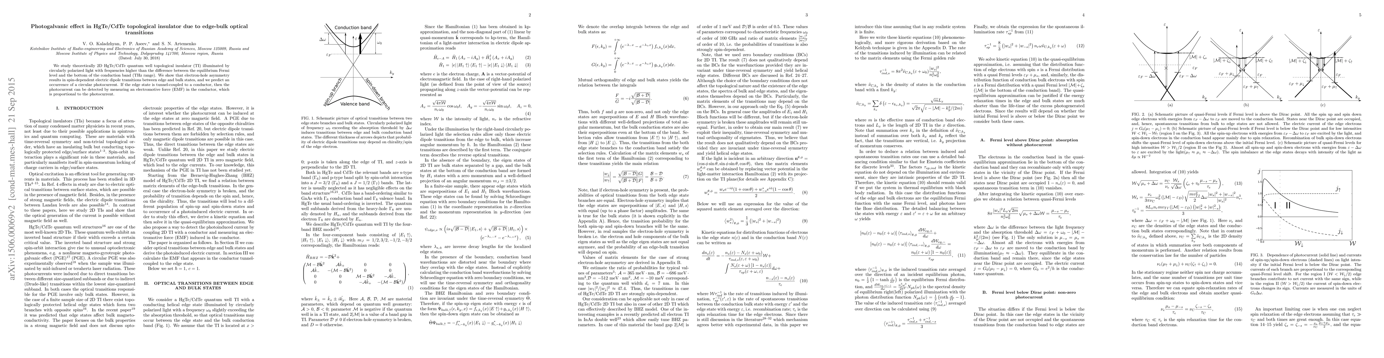 This paper theoretically explores the photogalvanic effect in HgTe/CdTe topological insulators, demonstrating spin-dependent electric dipole transitions between edge and bulk states under THz light, leading to a detectable circular photocurrent via an electromotive force when edge states are coupled to a conductor.